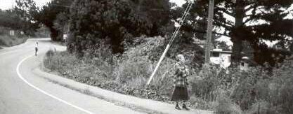 Wide angle shot of Highway 1 as it leaves town going south. We see the curve of the road where it turns onto Arenal. There is a person (female) standing there looking that direction. Another woman with folded arms in a checkered jacket, skirt and boots is walking along the raised sideway alongside the highway. The part of the roadside is overgrown with weeds and shrubs and trees. Beyond and through the foliage can be seen a bit of the motel(?) rooftop.Collection