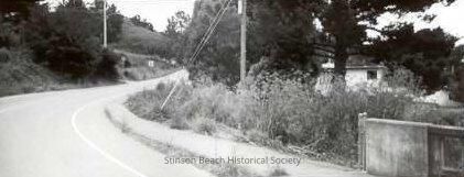 Wide angle view of Highway 1 going south as it leaves town. It follows a bend to the right beginning at the concrete bridge on the lower right side. Beyond the top floor of the motel(?) is visible through the branches of a large tree and the overgrown foliage along the road. There is a raised concrete sidewalk along the road. Across the highway is the hillside with some darker trees and roadsigns.Collection