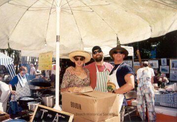 Two men and a woman stand together under a large off-white umbrella set up to shelter a food stand. A bearded man with dark glasses and black bandana, red shirt and green & white striped chef's apron stands in the center with his arm around the shoulder of a woman on the left and another fellow mugging for the camera on the right. The woman wears a paisley scoop neck dress, straw hat and sunglasses. The fellow also has on sunglasses, a brown rimmed hat, blue t-shirt and white apron with a Mexican logo. They're all standing behind a brown cardboard box with BOUDIN printed on it and a blackboard on which is printed in chalk T and Anderson. In the background, left side, is a woman in apron barbequeing on a big black grill with tongs in one hand and the lid on the other. Right background a person in floral coveralls in working over a table with a blue checkered tablecloth. On the table are flowers, paper cups and sundry items. Beyond her on the fence are hung framed photographs.Collection