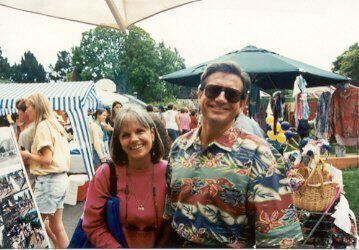 Happy couple (Connie Clark and unknown fella) stand side by side smiling at the camera in the center of the Green. She wears a red long-sleeve sweater and gold chain and sunglasses hung around her neck and black shoulder bag over her shoulder. He is in a brightly colored Hawaiian-type shirt and sunglasses. The various vender booths can be seen in the background as well as baskets and articles of clothing hung from a green umbrella and quite a few people.Collection
