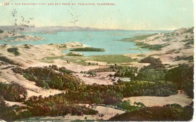 A colored postcard of a view from the top of Mt. Tamalpais showing barren brown summer hills below and the SF Bay. On front of the postcard, the caption reads: 145 - San Francisco City and Bay from Mt - Tamalpais, California. The card is addressed to Miss Bertha Heine, 1124 Fulton St, San Francisco. Written Aug 17th- Greetings from Green Brae, Freda. The Year stamp says 1910 or 1919.Collection