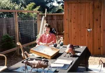 Color photo of Judy Stemen sitting in the corner of the Village Green behind a table of insect sculptures. She is wearing a red shirt and a big smile. On the display table is a framed glass case tilted up for viewing, an open notebook, and a number of large insect sculptures: grasshopper, beetle. Behind her is a wire mesh fence and a tall wooden cabinet.Collection