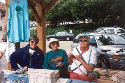 Three Stinson Beach Historical Society women (l. to r.) Jane Slack, Shirley Moyce and Virginia Bewley sit on the wooden bench at the Village Green entrance behind a table displaying a sign/price list reading "Any Photo Any Size" along with books and shirts. There is a turquoise shirt with the Village Green logo handing above and behind them. All 3 ladies are wearing dark glasses. Jane has on a navy blue jacket over a white logoed shirt. Shirley is wearing a turquoise sweatshirt with gold, purple and maroon butterfly-type design on the front and white cap. Virginia also wears a cap and white shirt criss-crossed with narrow blue, red, green and gold stripes. Behind them are parked cars and bicycle.Collection