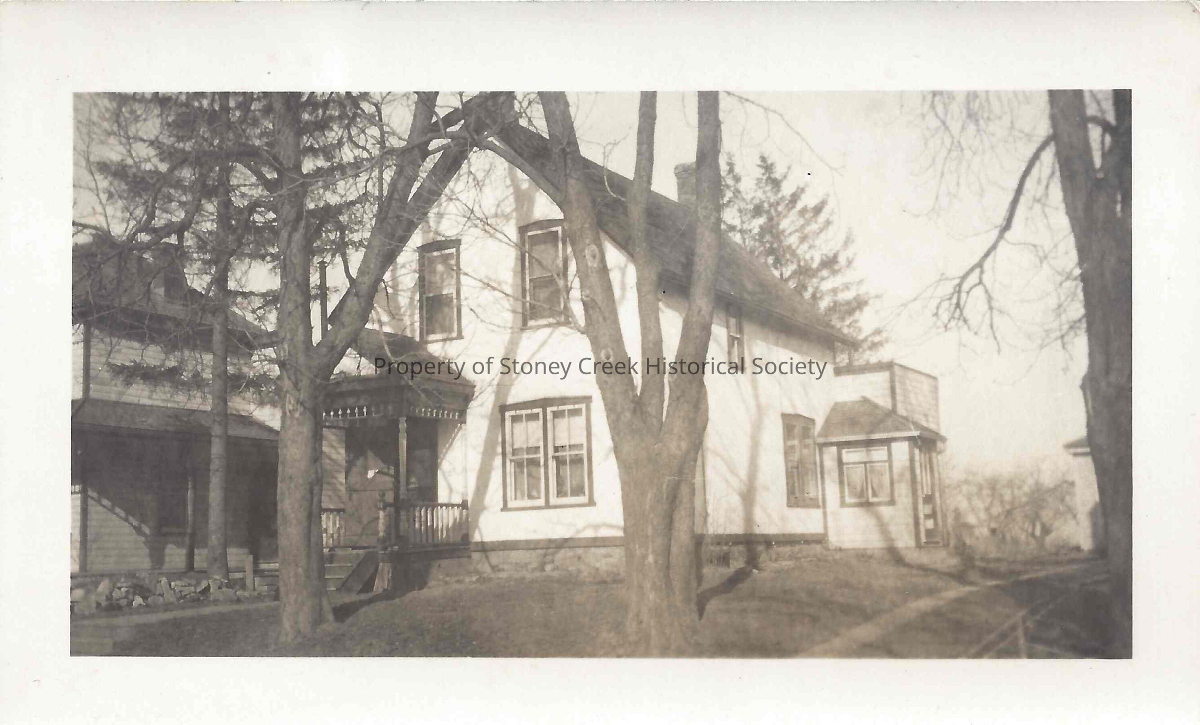 The image captures a quaint two-story house with distinct early 20th-century architecture, enveloped in a serene, somewhat barren landscape. The residence, predominantly white with dark trim around the windows and rooflines, features an array of windows that hint at a well-lit interior. The focal point is an inviting porch adorned with a decorative railing, further characterizing its historical charm. Mature trees punctuate the scene, casting intricate shadows and partially obscuring parts of the façade, lending an air of aged grace to the property where Minnie Miller once lived.