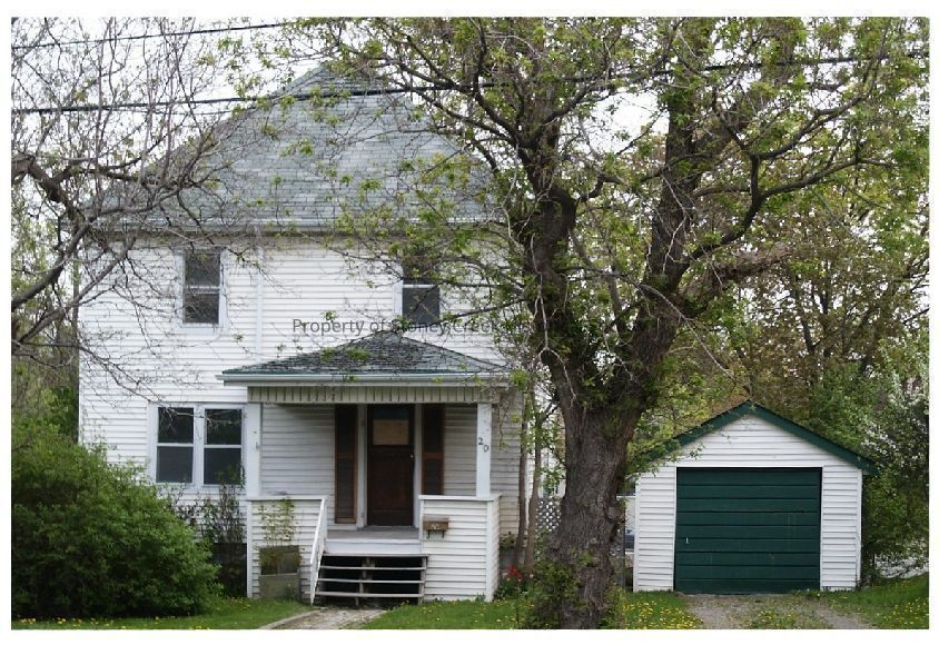 The image depicts a quaint, two-story, white house with a gabled roof and weathered siding, known as 20 King St W or formerly The Brandow House. A large, leafy tree dominates the front yard, casting shadows on the building while partially obscuring the upper windows. Adjacent to the house, a small green garage stands, enhancing the rustic and serene setting of the property. The home's front porch, with stairs leading to a screened door, invites a sense of welcoming and homely charm, typical of residential architecture from past decades.
