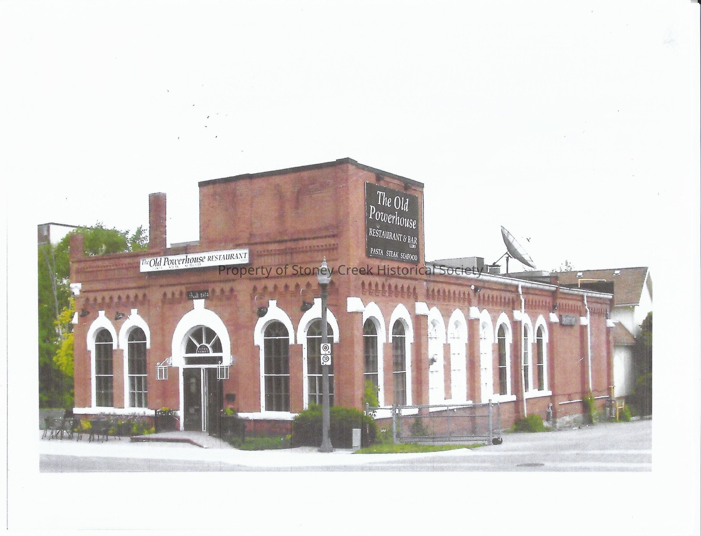 "The Old Powerhouse restaurant and Bar" . Originally built to be the powerhouse for the Hamilton, Grimsby and Beamsville Street Railway. Opened in 1894.The 2 condensing engines were powered by water supplied from The Stoney Creek and a small pond to the west(left side of the building. The supply of water from the creek was quite minimal and a new power center was built in 1898 at Decew Falls in St Catharine's and the use of the powerhouse diminished. The building was purchased in the 1980 and converted to a restaurant. The current existing restaurant contains some very unusual collectors pieces. The ceiling fan above the bar was from the set of Humphrey Bogart's film, Casablanca. The storage unit behind the bar was repurposed from The St Patricks church in Buffalo NY. The ceiling chandelier at the front entrance was once owned by Mark Twain and originally in the a restaurant at The Cloisters and there is half of a confessional booth at the entrance to the washrooms.Location