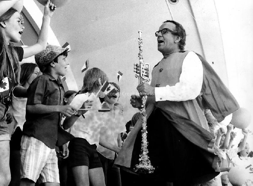 This image captures Bobby Gimby playing a trumpet at the Stoney Creek Canada Flag Day Parade, surrounded by enthusiastic children waving Canadian flags. Bobby, often called Canada's Pied Piper, is dressed in a vintage outfit with a cape, leading a festive and joyous celebration, eliciting smiles and participation from the kids around him. The scene is lively and conveys a sense of community and national pride during this celebratory event.