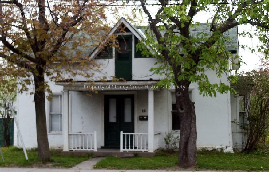 The image presents a quaint, two-story house with a classic design featuring a dark green front door, white exterior walls, and a cozy porch with white railings. The upper story has a small window with a green roof above it. Two large trees frame the house on either side, their leaves partially covering the view of the facade. The branches and leaves suggest the season is either spring or early autumn. The house has a peaceful suburban ambiance, with a well-maintained front yard and a paved walkway leading to the entrance. Shrubs and small plants line the base of the foundation, adding a touch of greenery to the surroundings. The atmosphere is serene and inviting, suggesting a family-friendly neighborhood.