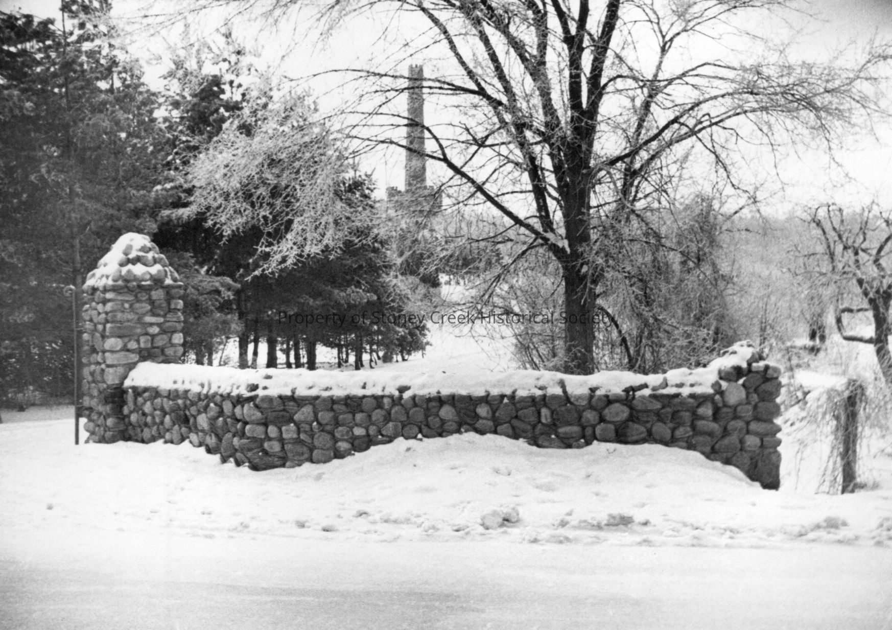 The entrance to Battlefield Park after the snowstorm of 1944. The Monument can be seen in the background.