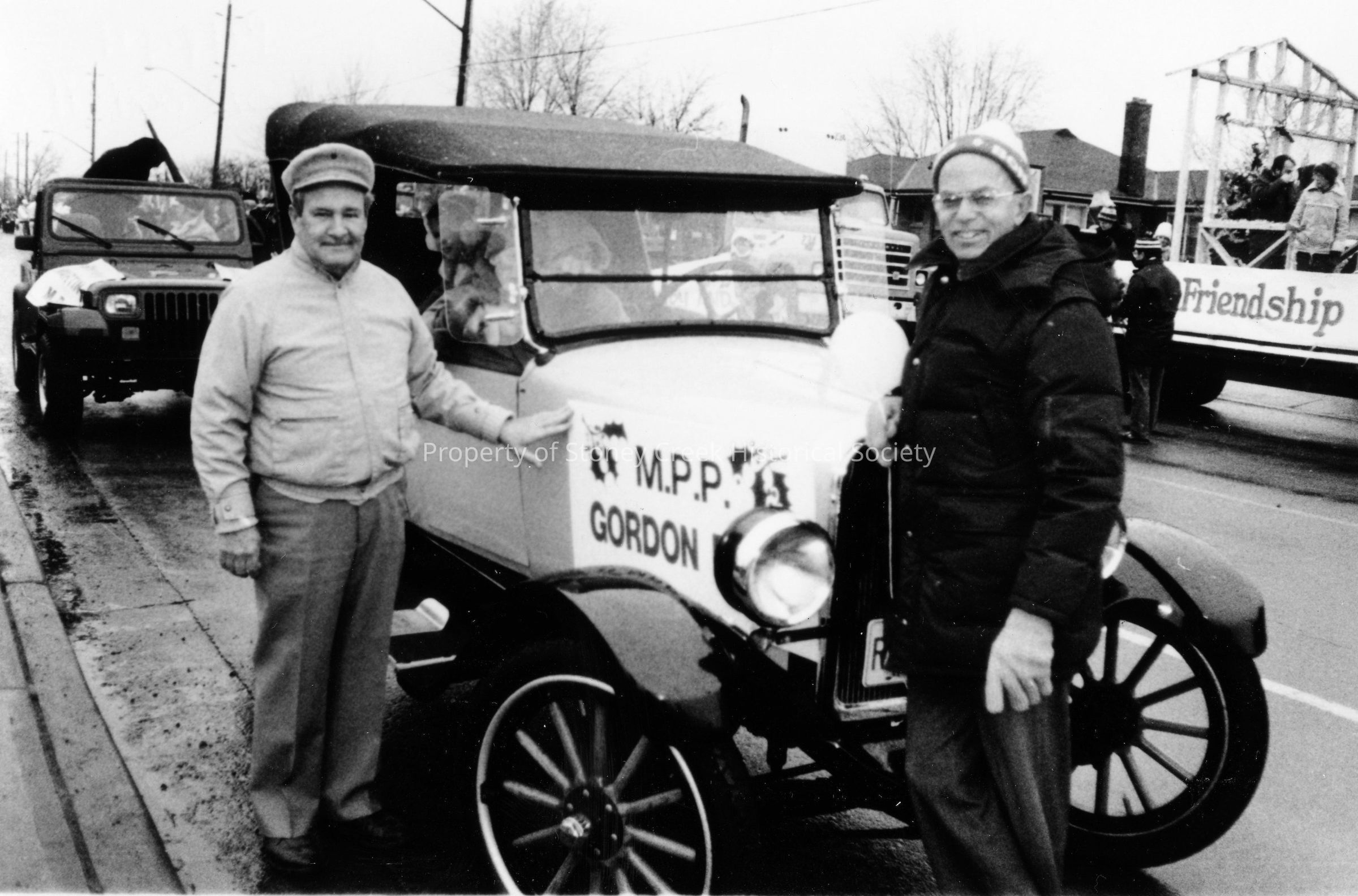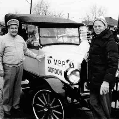 Ivan Black, owner and driver of Antique Car at Stoney Creek Santa Claus Parade,with Dean Gordon MPP. Dec 6, 1986.