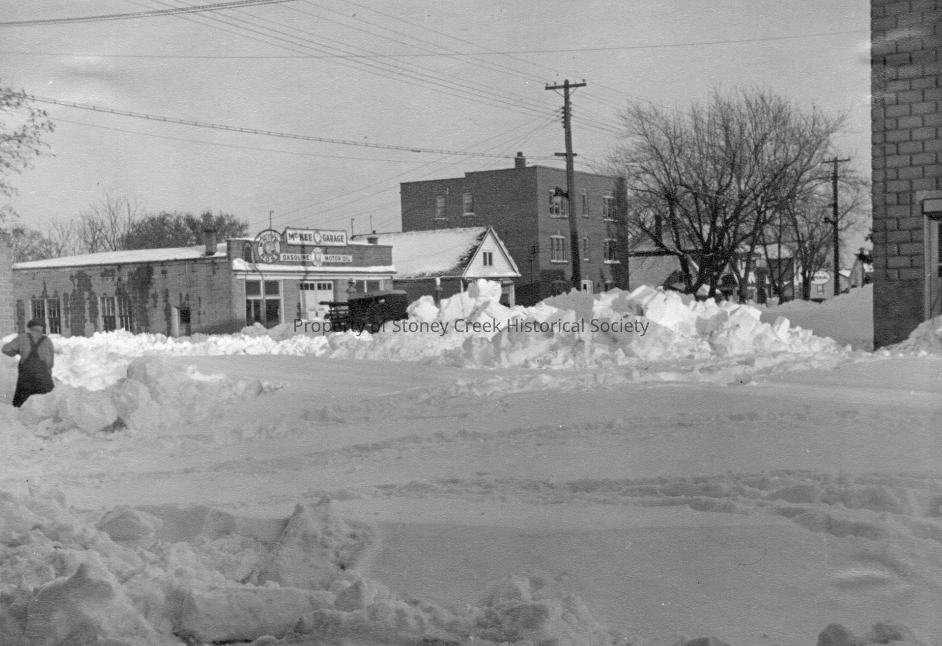 King Street E. (North Side) after snow storm winter 1944. McKees Garage on the left.