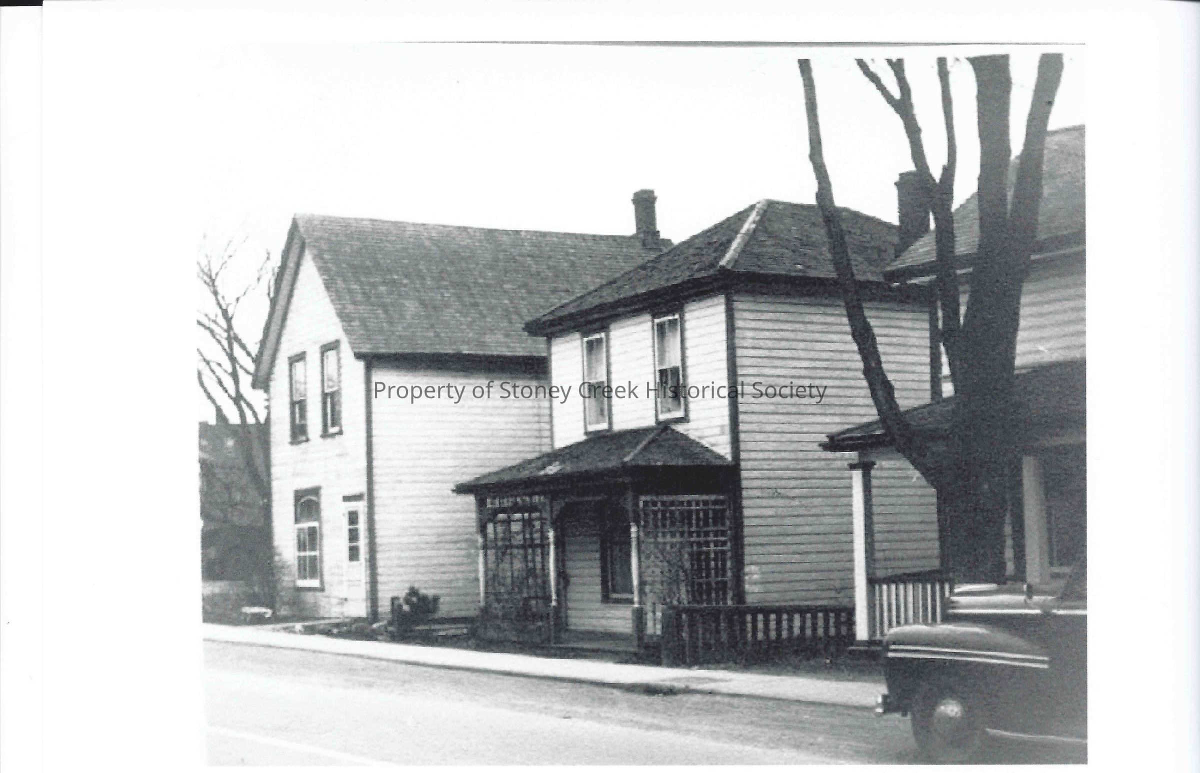 The image captures a historical street scene from downtown Stoney Creek in the 1940s, showing MacDougall's original shop located on the far left. This black-and-white photograph features two prominent buildings with wooden siding and a classic car parked on the street. The architecture suggests a quaint, mid-20th-century small-town vibe, with details like the small porch and awning, characteristic of the period's store fronts.