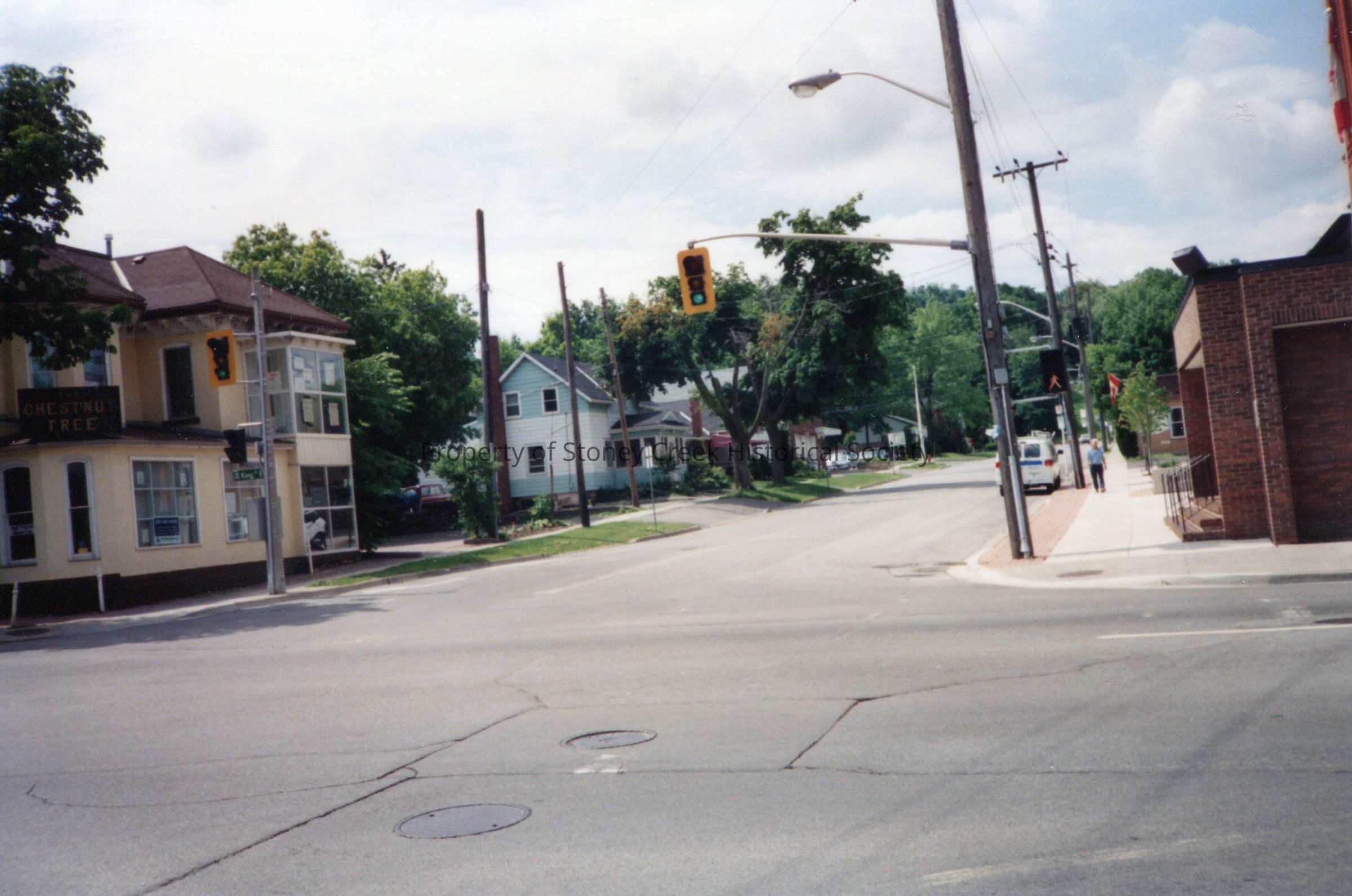 Lake Avenue looking south. August 1993. Chestnut Tree on left, Stoney Creek United Church on Right.