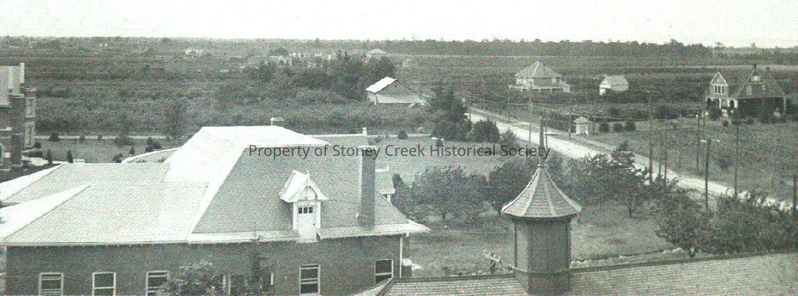 1918. Looking west from E. D. Smith factory above the shipping depot cupola. Fairview house in foreground. H G & B passenger chalet visible. In the distance is the Glover farm.