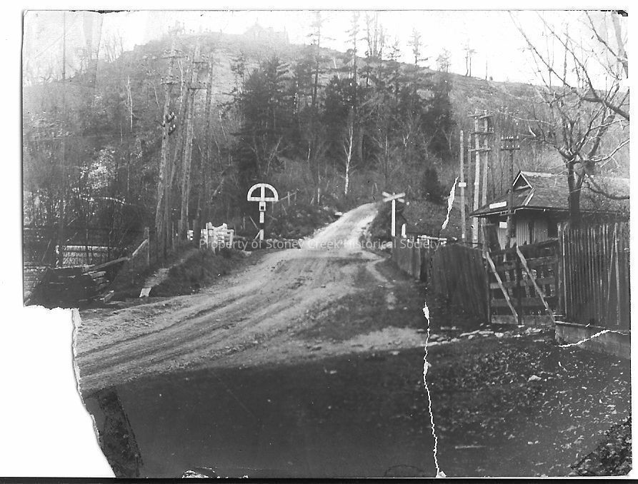 The image depicts a rustic scene at Mountain Road, heading south by the Toronto, Hamilton, and Buffalo railway line at Stoney Creek Station. A dirt road meanders through, flanked by leafless trees, running adjacent to the railroad crossing, which is marked by a simple crossing gate. In the foreground, the road seems worn and muddy, leading to a small building and a fenced area on the right. The background shows a densely wooded hill, giving the setting a serene yet secluded feel. The photograph has a vintage look, characterized by its black and white tone and some visible wear and tear on its edges.