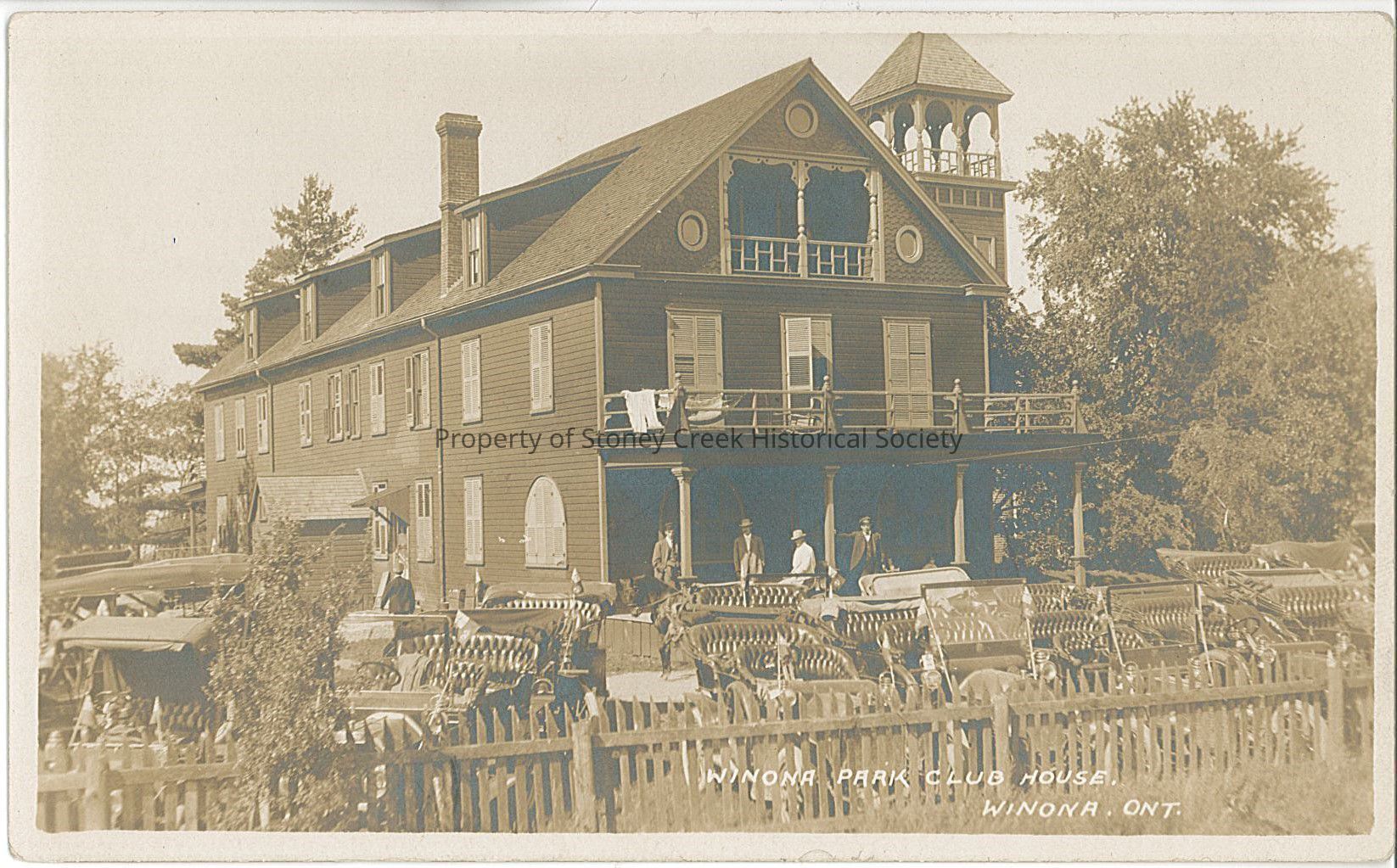 Winona Park Clubhouse approx 1920s. The Winona Park Hotel was opened from 1897 to 1928 and supplied accommodations for 100 guests.The hotel was open from May 28th to Oct 14.Rates were from $7 to $14 per week depending on number of people occupying your room.This was the former home of The Honourable John H Willson.Location