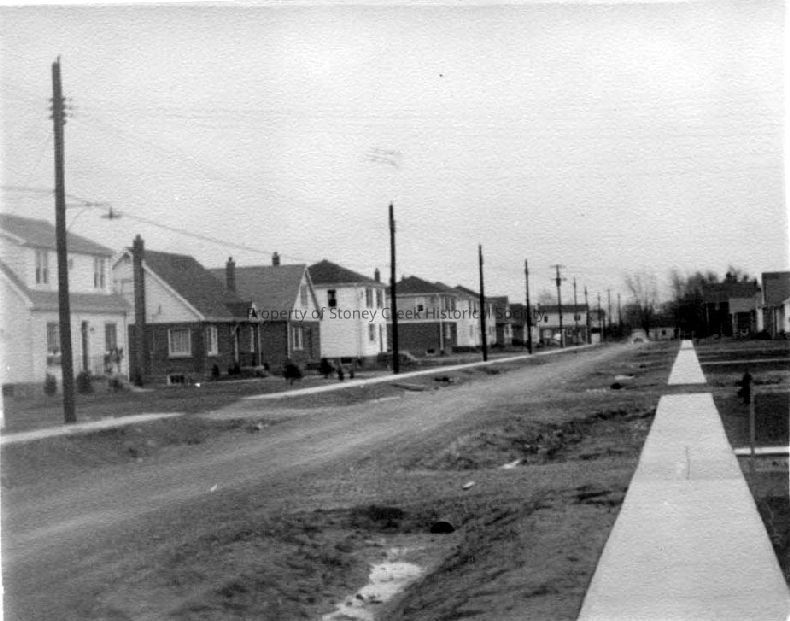 The image shows a suburban street, depicting Randall Ave in Stoney Creek from 1950. It features a row of modest, detached houses with varied facades, neatly spaced along a straight, unpaved road. Sidewalks are visible, but the road surface appears rough and unfinished, with some puddles. Utilities are evident with several poles lining both sides of the street, stretching into the distance under an overcast sky. The neighborhood conveys a quiet, mid-century suburban environment, typical of post-war residential development.