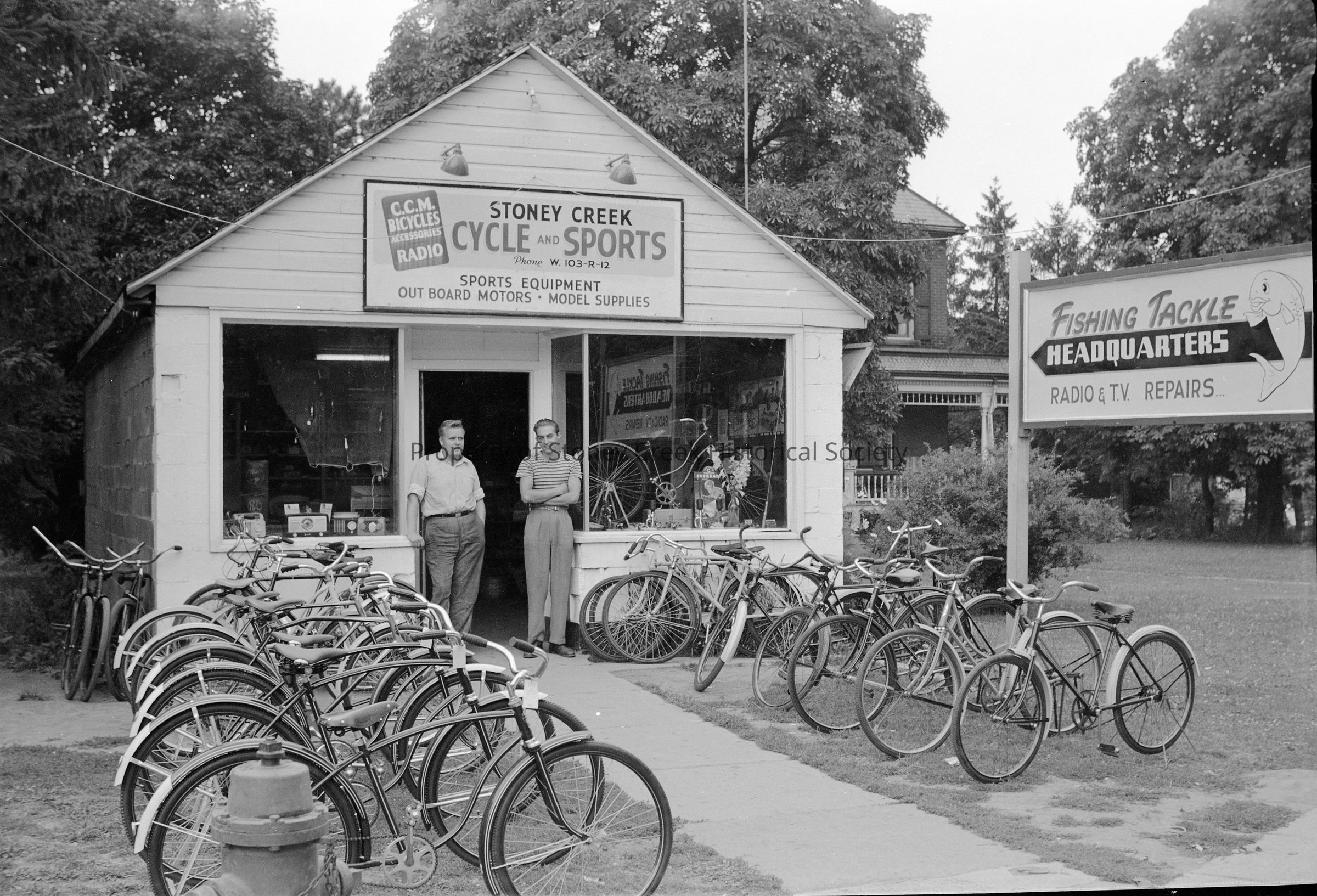 Stoney Creek Cycle and Sports located at 83 King St E and Rosedale close to where Attic Pizza is located.House in behind to the right is The Piott House,which was relocated to Loma Ave in 1955.Alex Smith was the original owner of SC Cycle and Sports.He eventually relocated to The Milmine Building and then to the shop right next door to what is now The Legion at 20 King St E.
