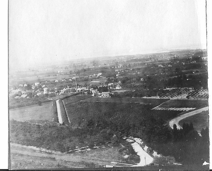 The image shows a sweeping view of Stoney Creek captured from the top of New Mountain Road. In the foreground and to the left, a large agricultural field dominates alongside a curving road. Middle-ground features scattered homes amidst varied vegetation. The distinctive smokestack of The HG and B Powerhouse stands out in the center, defining the industrial edge of this otherwise bucolic landscape. Further back, a broad, flat expanse opens to the horizon, blending into a hazy sky, giving the scene a historical atmosphere indicative of an early 20th-century industrial community amidst natural settings.