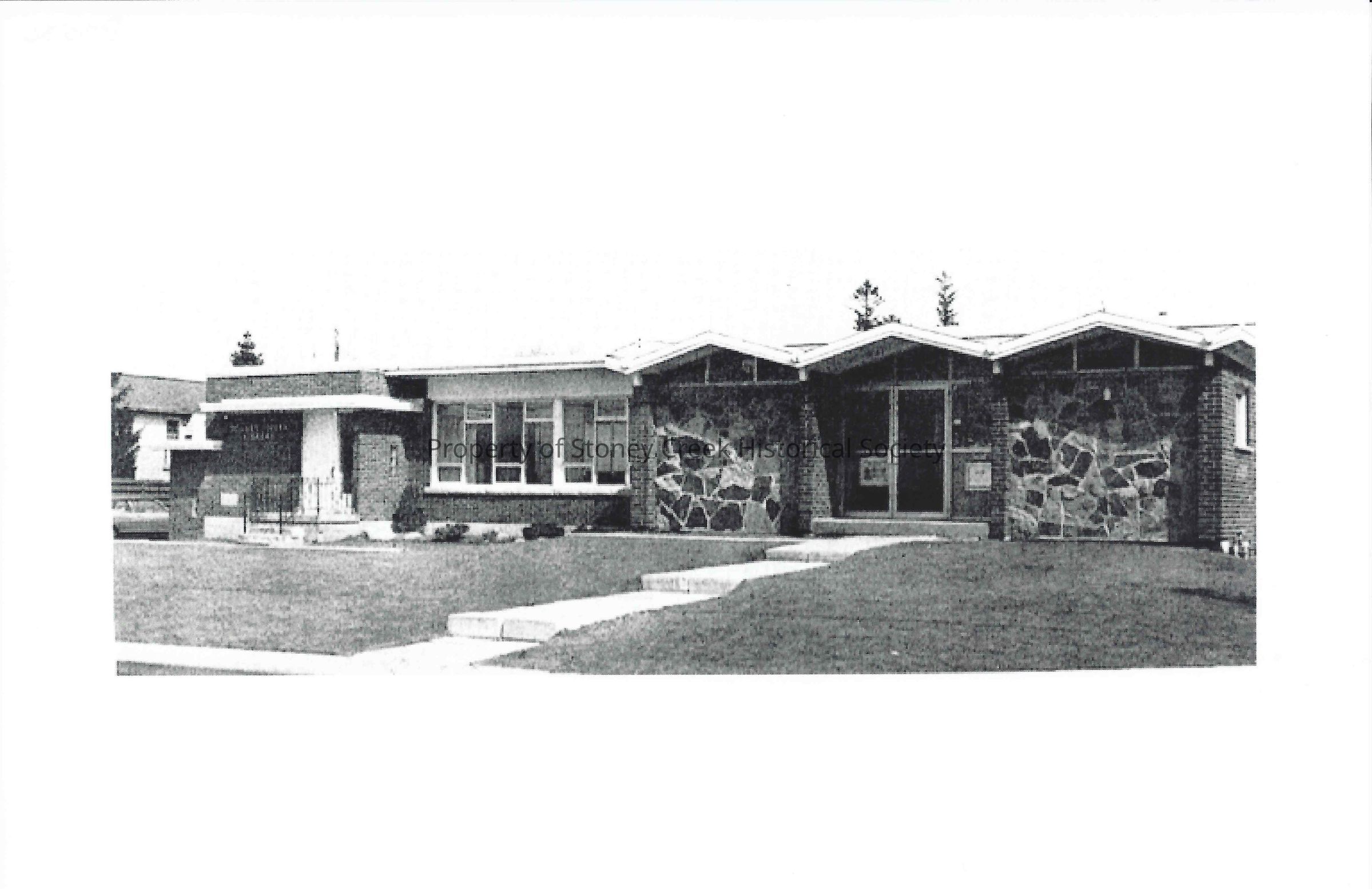 Stoney Creek Library, Second Street North was constructed in 1959. Prior to this, the library was housed in various private homes including Lorne and Flora Weedmark's home on 30 King St. When it was sold Joseph Piott, provided a small frame building on the creek bank rent free. It was later moved to a basement room in Holt's Drug Store. In 1958 it was decided a permanent library building was needed. A site was found on Second St N and the land was donated by Don McLeod and the Hydro Electric Commission. It was built at a cost of $19,000. The new library saw it's circulation double in the first year.
