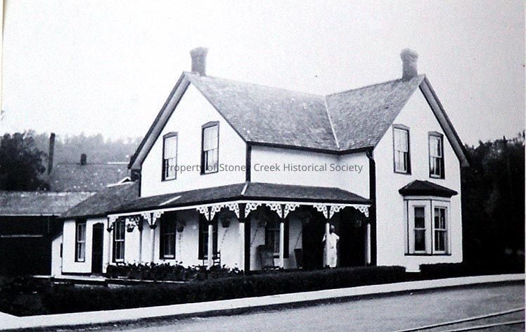 The image depicts a quaint two-story house characterized by its Victorian architectural details, including elaborate lace-like trim and a gabled roof. The structure is adorned with a covered porch and surrounded by a visible road and lush greenery, with a slightly faded, black-and-white quality that suggests an older photograph.