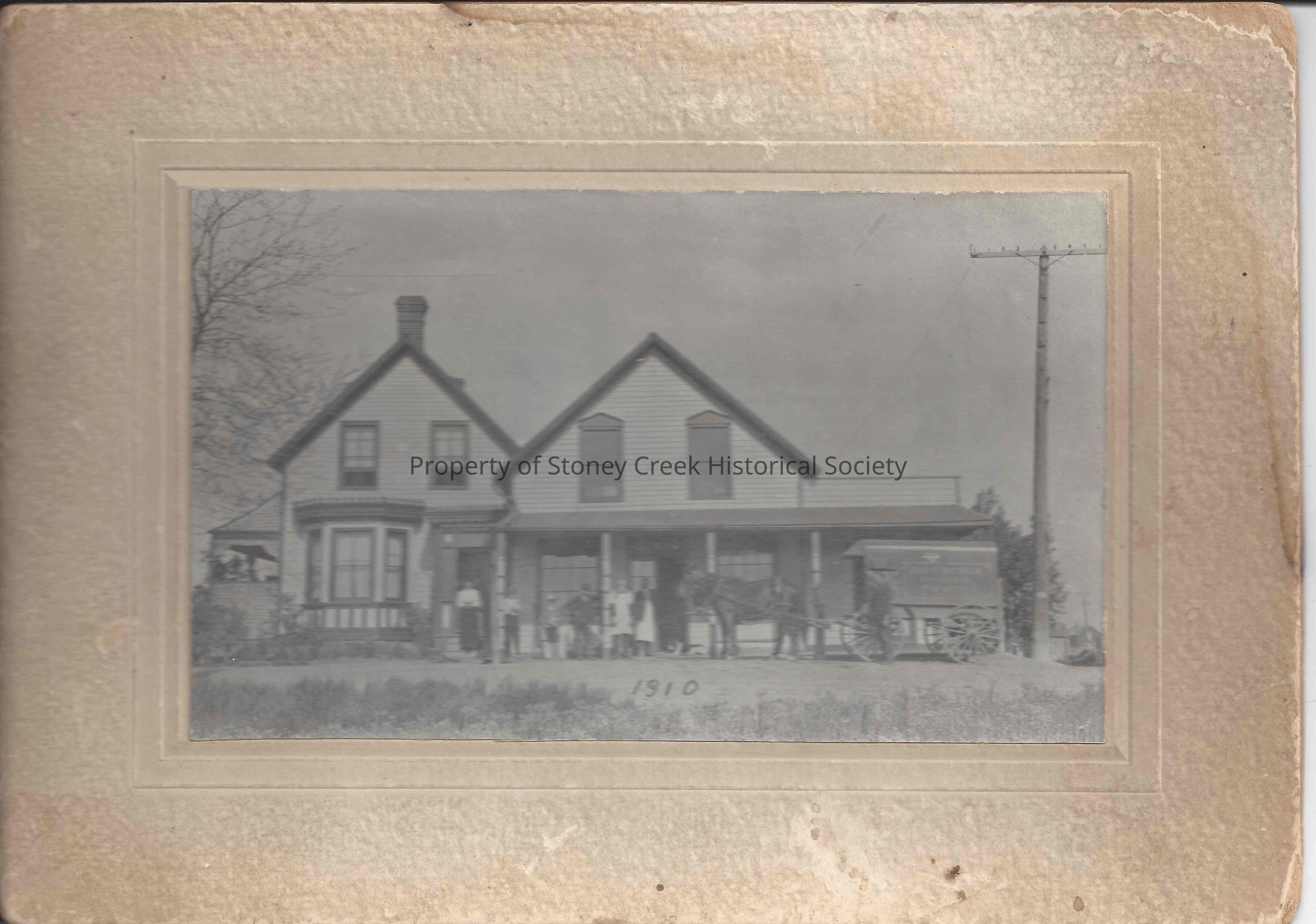 The first post office for Upper Canada was located here. In this picture, Mr John Budge is with the apron and a coat over it. His wife is at the door of the house. The store was taken down in 1946 and the lumber was used to build a house on Winona Rd.