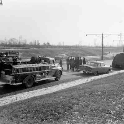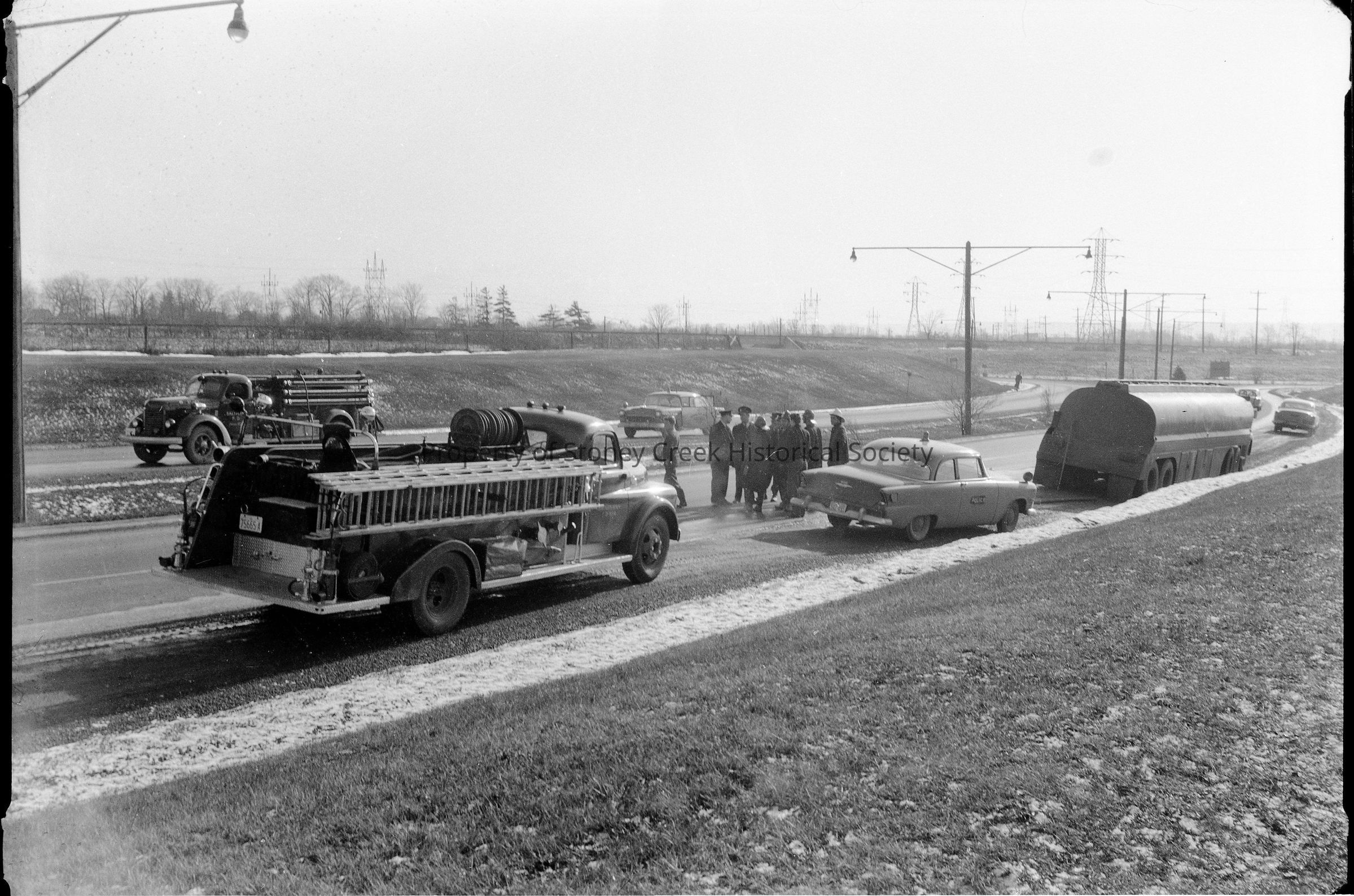 Truck on fire on QEW. Fire trucks and police car. 1957