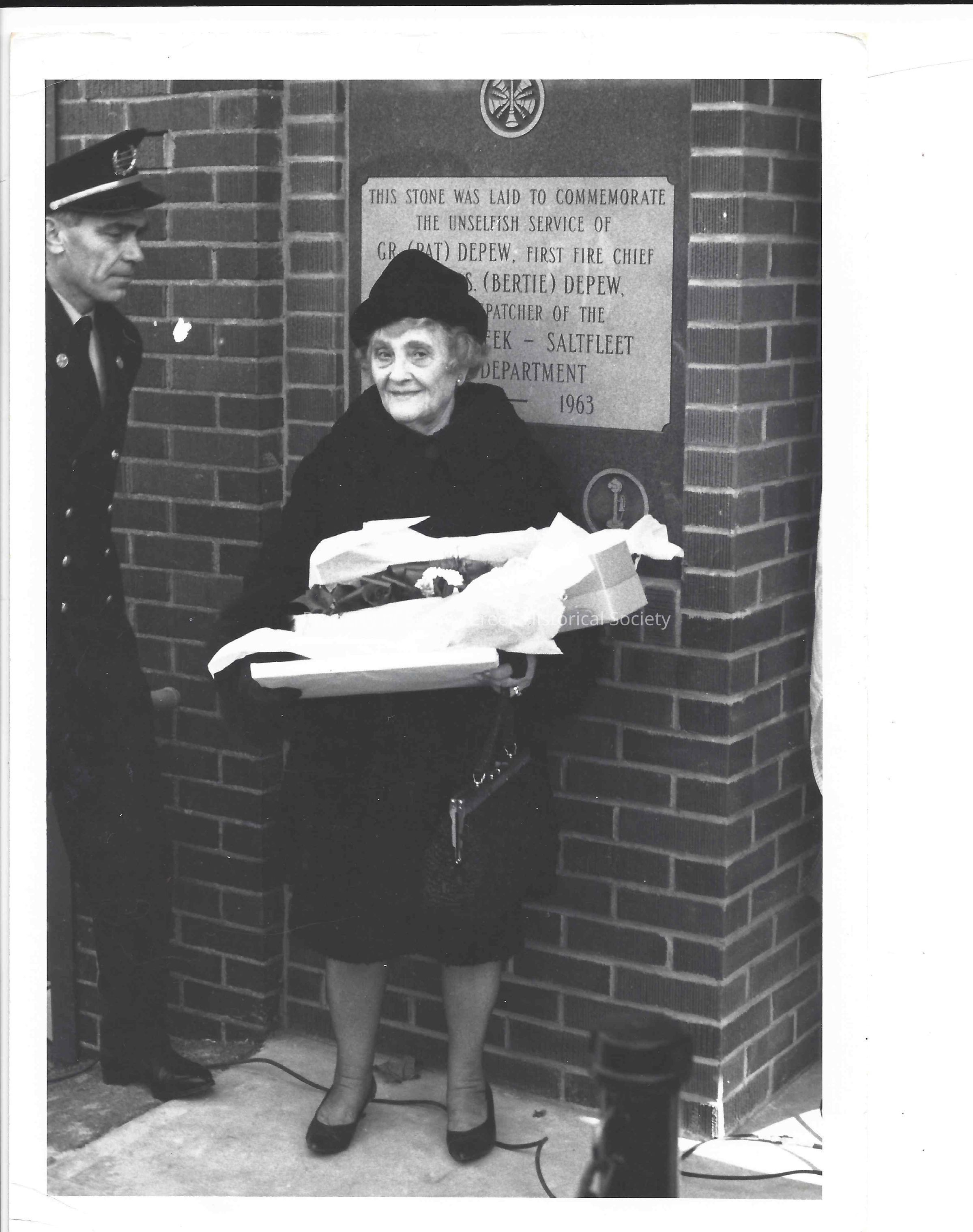 Unveiling of Stone to Honour Mrs. Bertie Depew. Bill Brandow with Bertie Depew. March 25 1963.