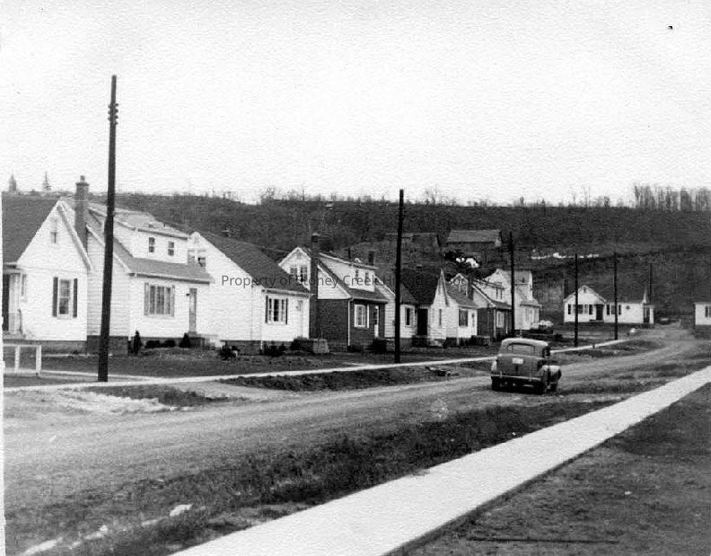 The image shows a view down Walker Avenue looking south towards First Avenue around the 1950s. The street is lined with small, neat houses, each set back from the road with tidy front yards. In the distance, a farm is visible on a hill above the residential area. A vintage car is parked on the side of the road, emphasizing the era of the photograph. The environment reflects a quiet, suburban setting typical of the time.