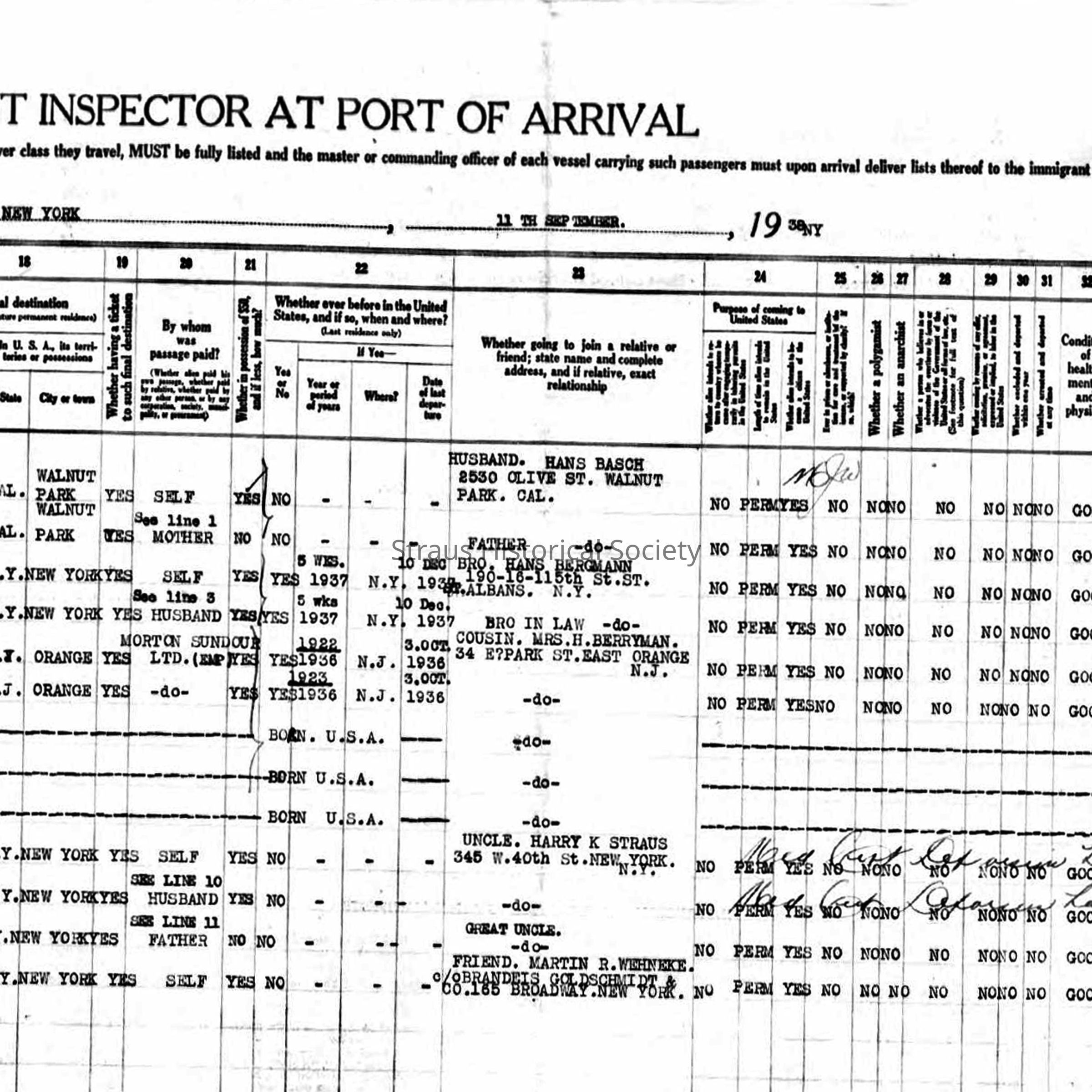 Passenger Manifest: Meyerhof, age 46, merchant, reads and writes German, born Hamburg, traveling with Annelise, age 36, wife, and Ursula, age 8, student, Liness 10-12. Sailed 3 September 1938 on the S.S. Georgic from Southampton to New York arriving on 11 September 1938. Two pages.