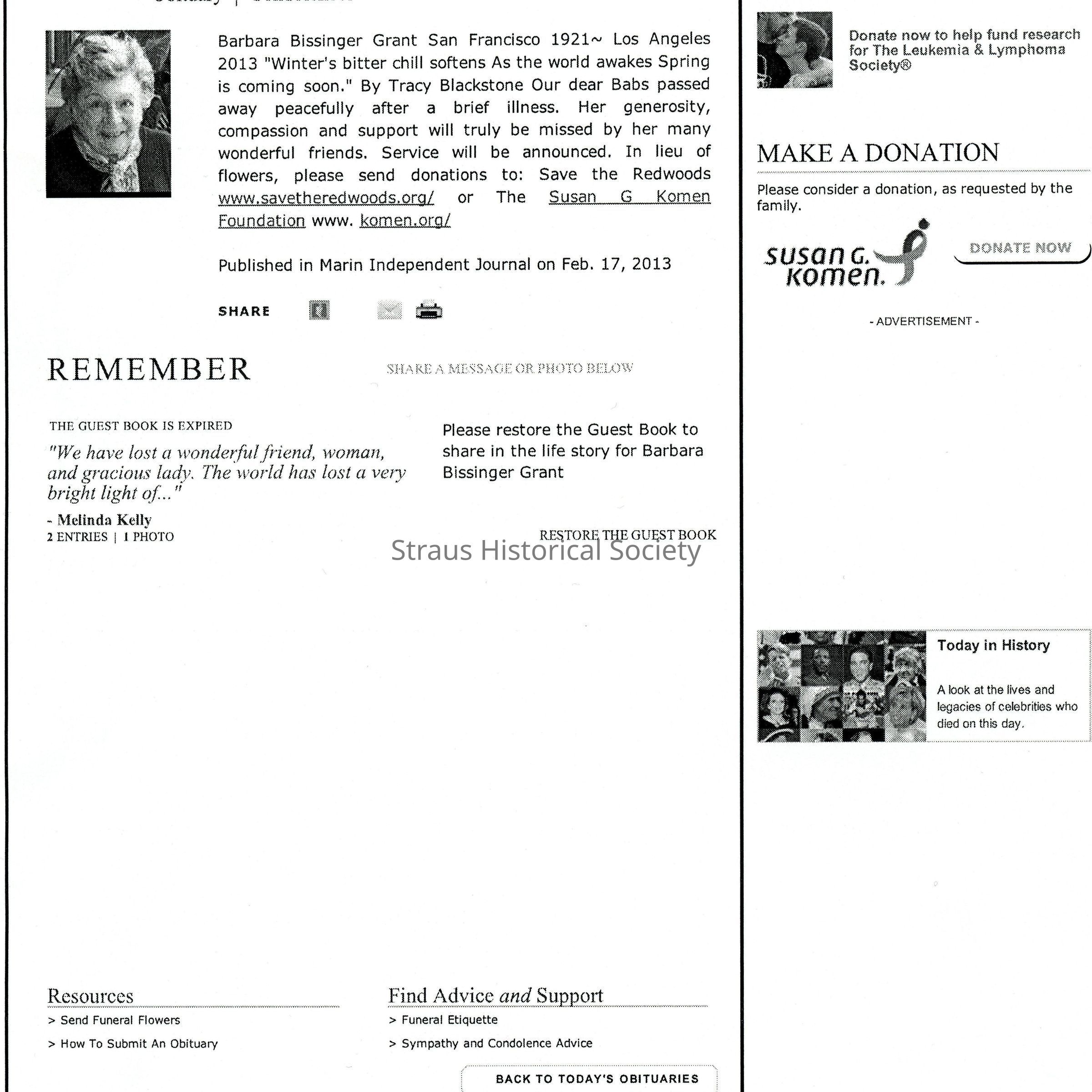 The announcement of the passing of Barbara Bissinger Grant, great grandaughter of Emanuel Straus.