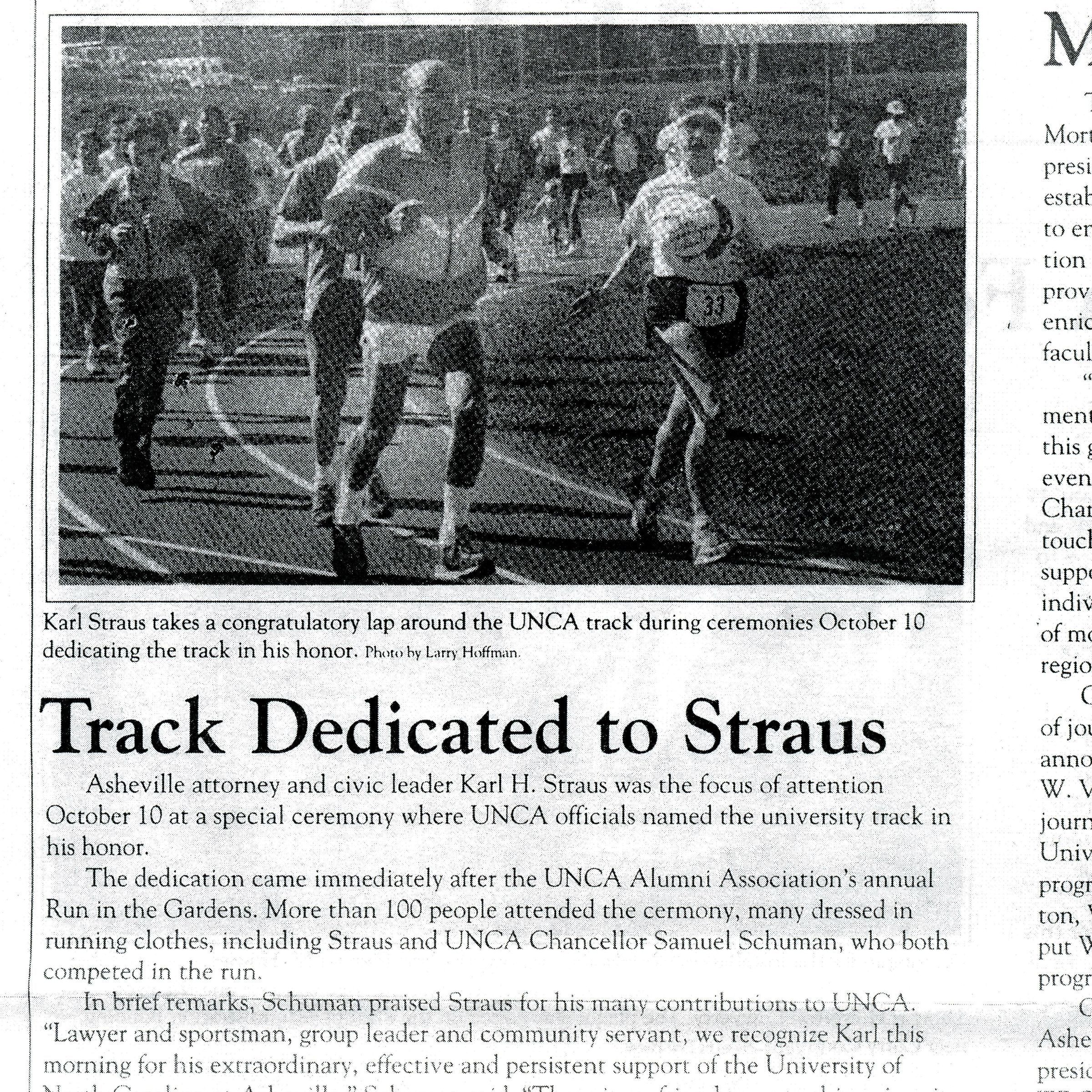 Article: Track Dedicated to Straus," UNCA Today. Spring 1993. One page with photograph.