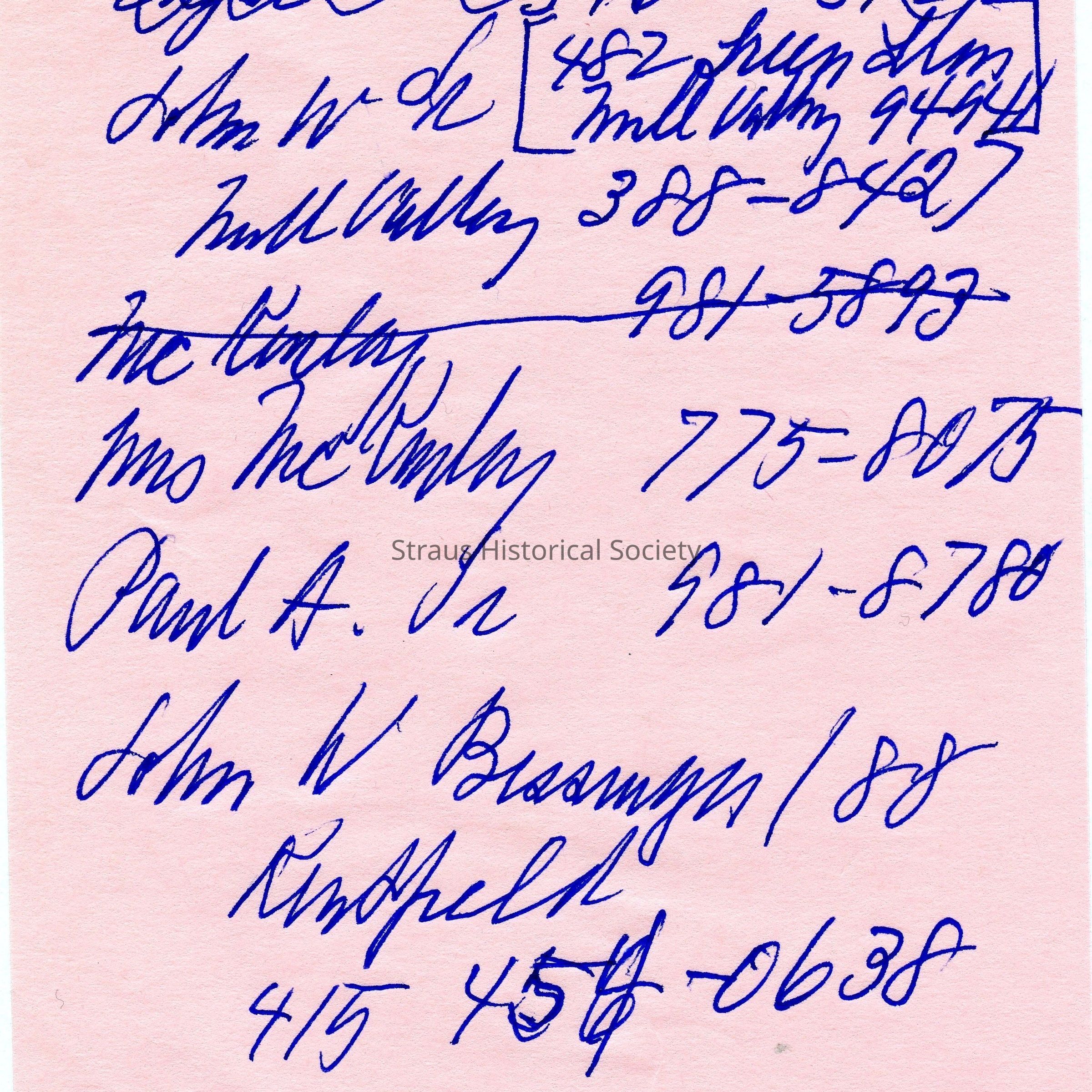 Research Material: Straus, Robert Kenneth, Santa Barbara, CA. 17 August 1982. Handwritten page with phone numbers of people named Bissinger.