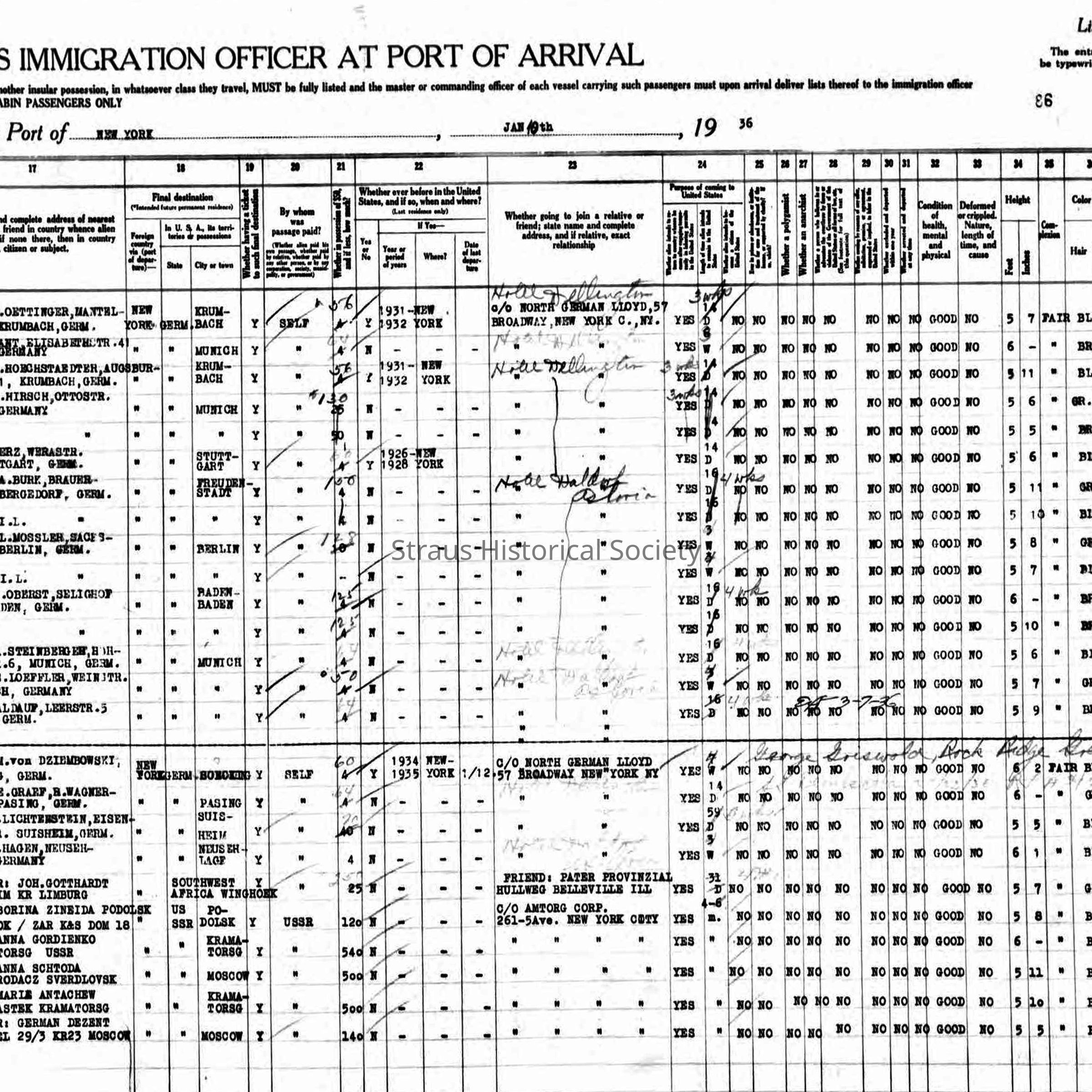Passenger Manifest: Baldauf, Grete, age 41, widow, born Mannheim, residing in Munich, Line 15. Sailed 3 January 1936 on the S.S. Europa from Bremen to New York arriving 10 January 1936.