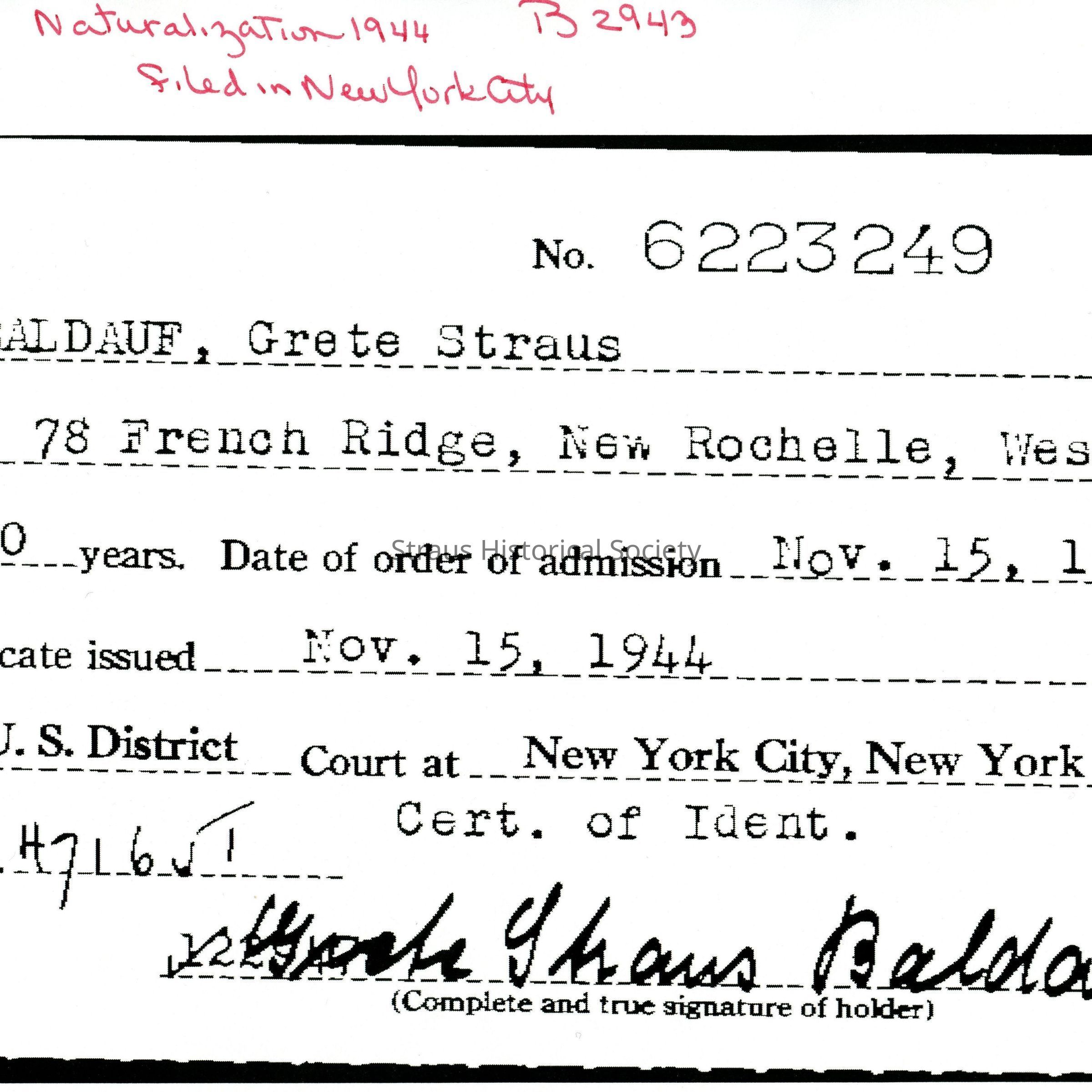 Naturalization # B 2943: Baldauf, Grete Straus, age 50, residing at 78 French Ridge, New Rochelle, N.Y., issued 15 November 1944 by the U.S. District Court at New York City, N.Y.