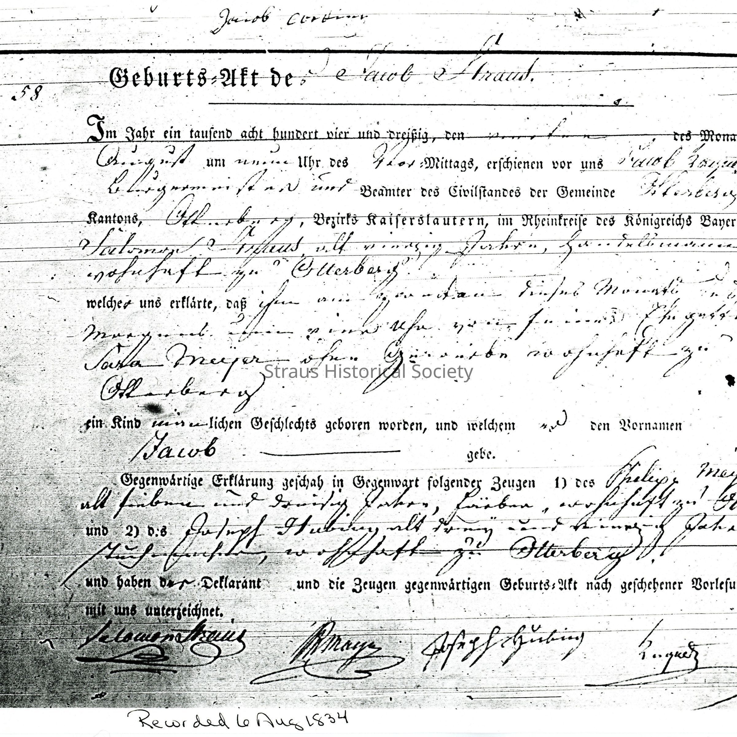 Birth Record # 58: Jacob Straus, so of Salomon Straus and his third wife, Sara Meyer. Recorded 6 August 1834 in Otterberg. Printed form with handwritten entries. In Old German.Entry/Object ID