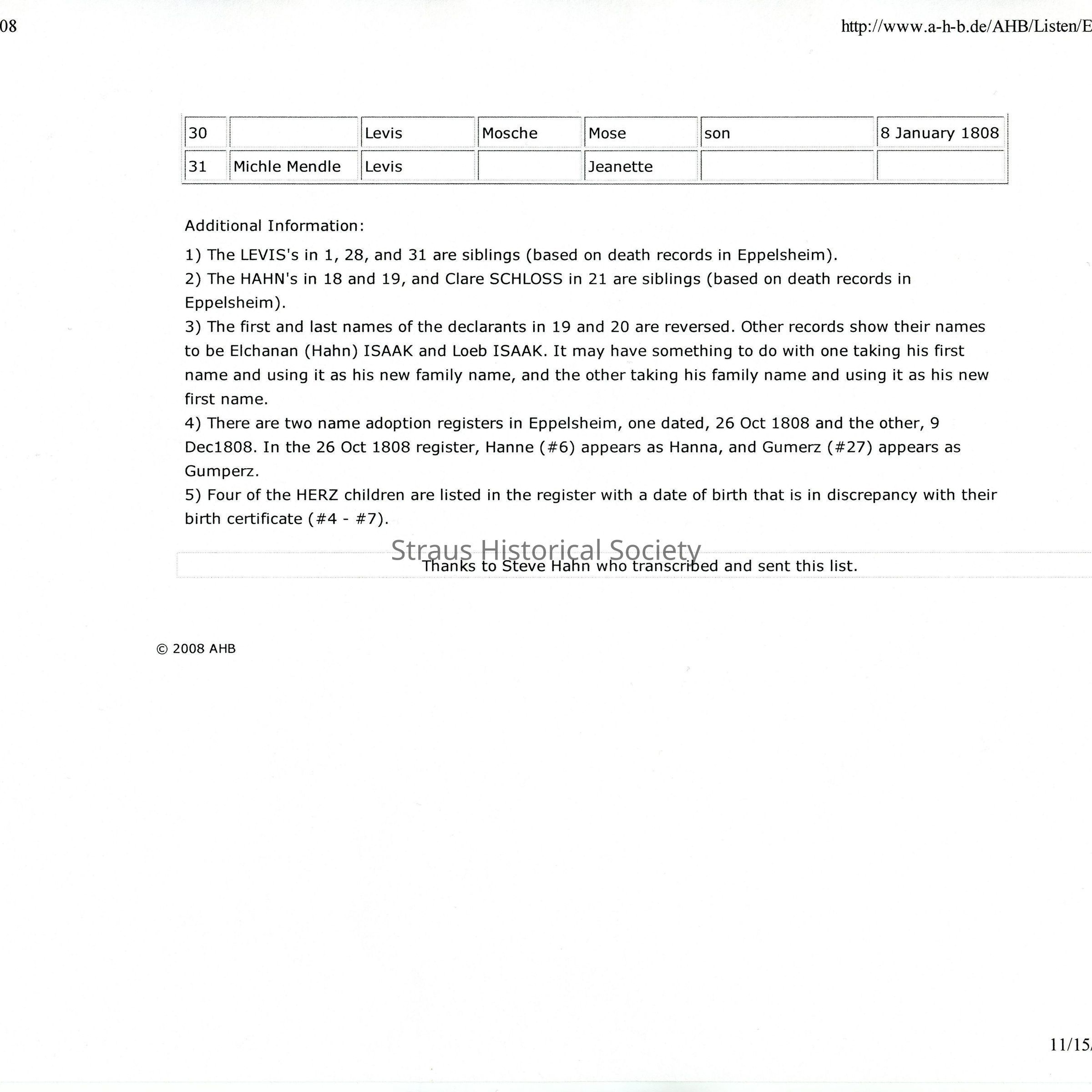 After Napoleon's Declaration of Regulating the Jews in 1808, all Jews were required to declare a last name. This entry is one of the lists of the old and new names. Several members and close relatives of the Straus family are on these lists.