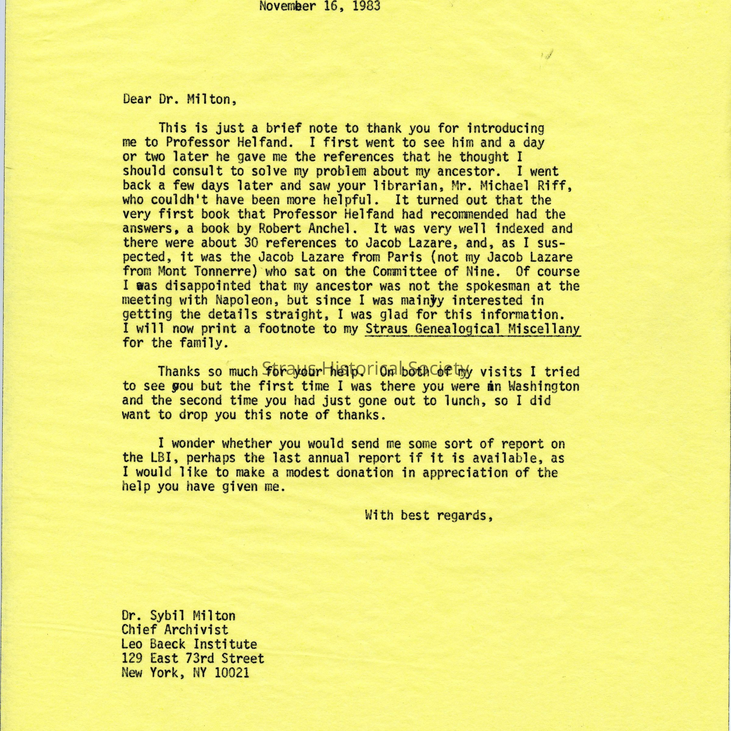 Letter: Straus, Robert Kenneth, Santa Barbara, CA, to Dr. Sybil Milton, Chief Archivist, Leo Baeck Institute, New York, NY. 16 November 1983.