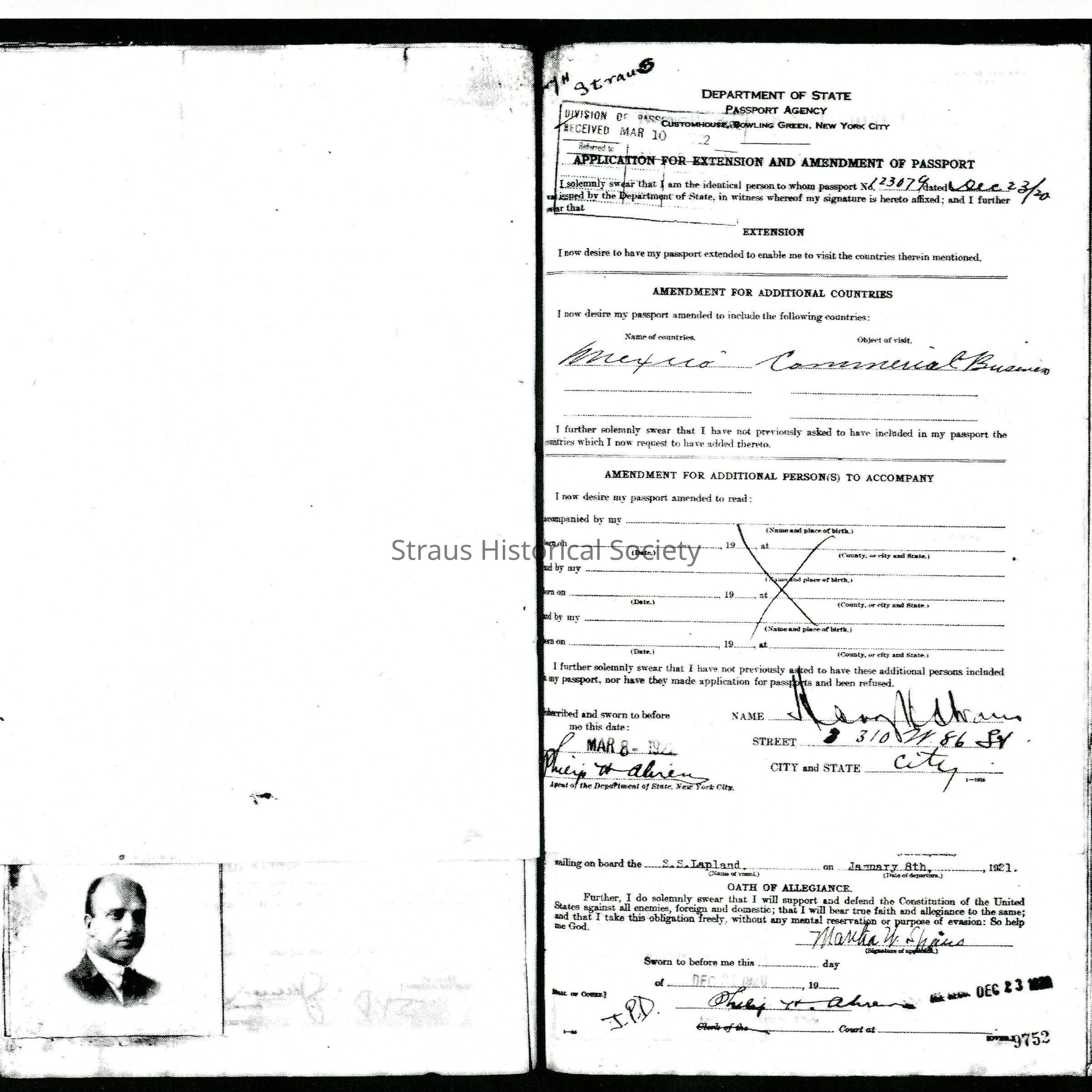 Passport: Harry H. Straus, Number 123079 issued in Washington. 29 December 1920.