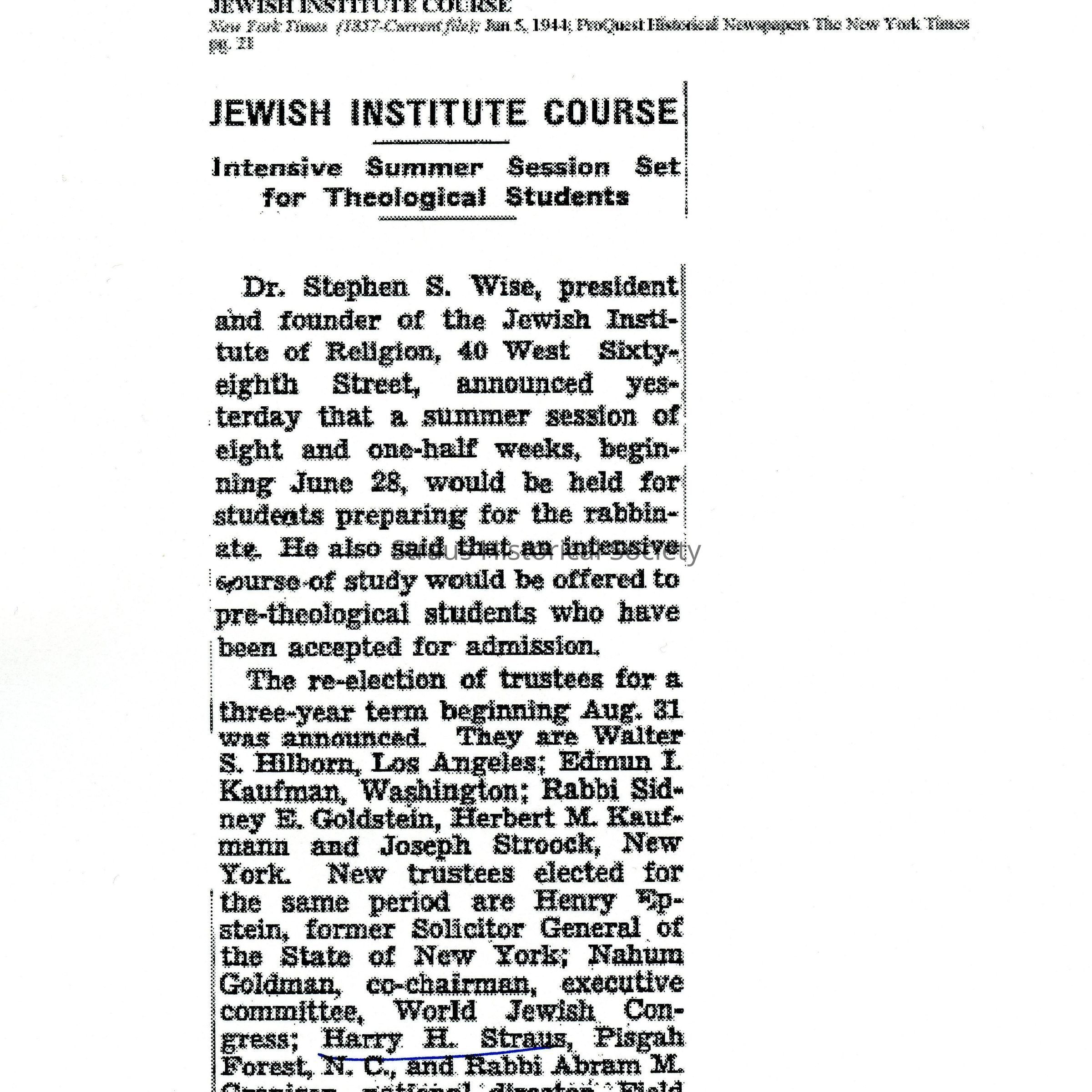 Article: "Jewish Institute Course: Intensive Summer Session Set for Theological Students," The New York Times. 5 June 1944.Entry/Object ID