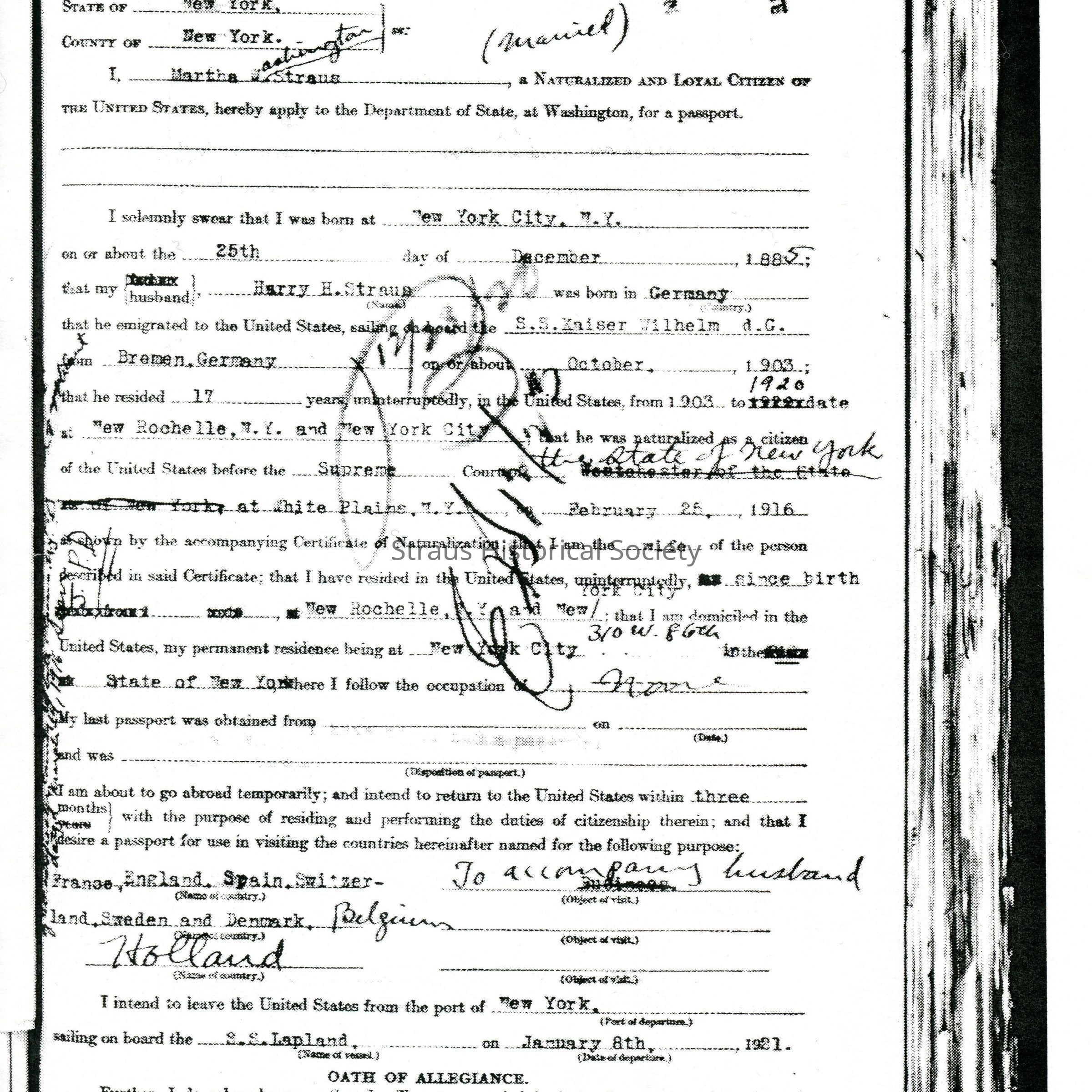 Passport: Martha Straus, Number 123080 issued in Washington 29 December 1920. Martha Straus is the wife of Harry H. Straus.