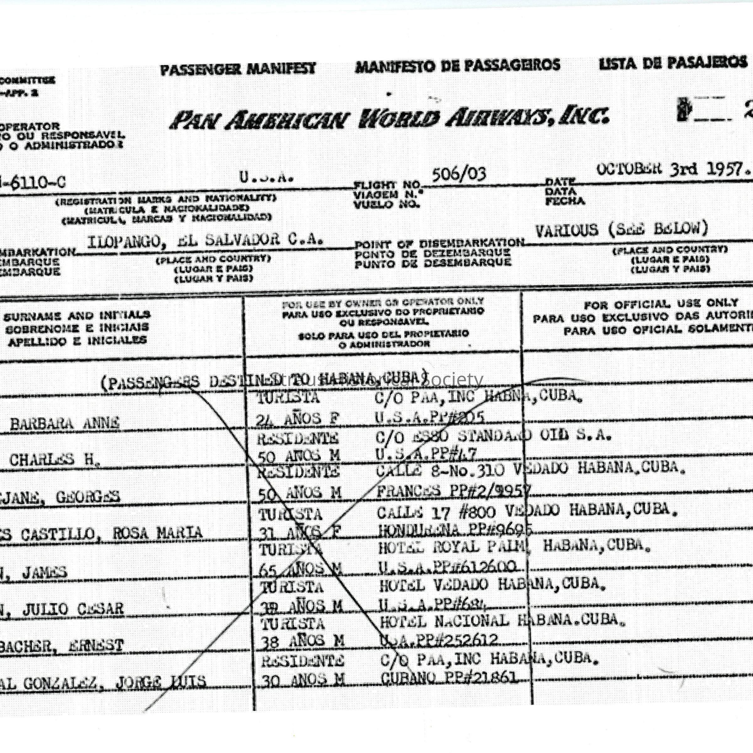 Passenger Manifest: Ernest Auerbacher, on "Pan American World Airways, Inc. Aircraft No. N-6110-C, Flight 506/03, 3 October 1957, Ilopango, El Salvador, C.A. One page.