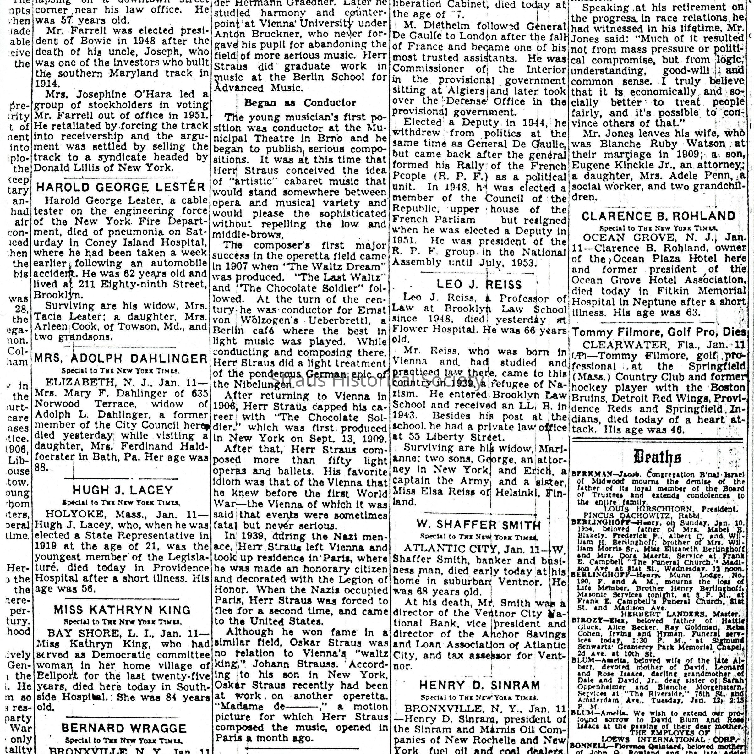 Obituary: "Oskar Straus, 83, Noted Composer," The New York Times, 12 January 1954.Entry/Object ID