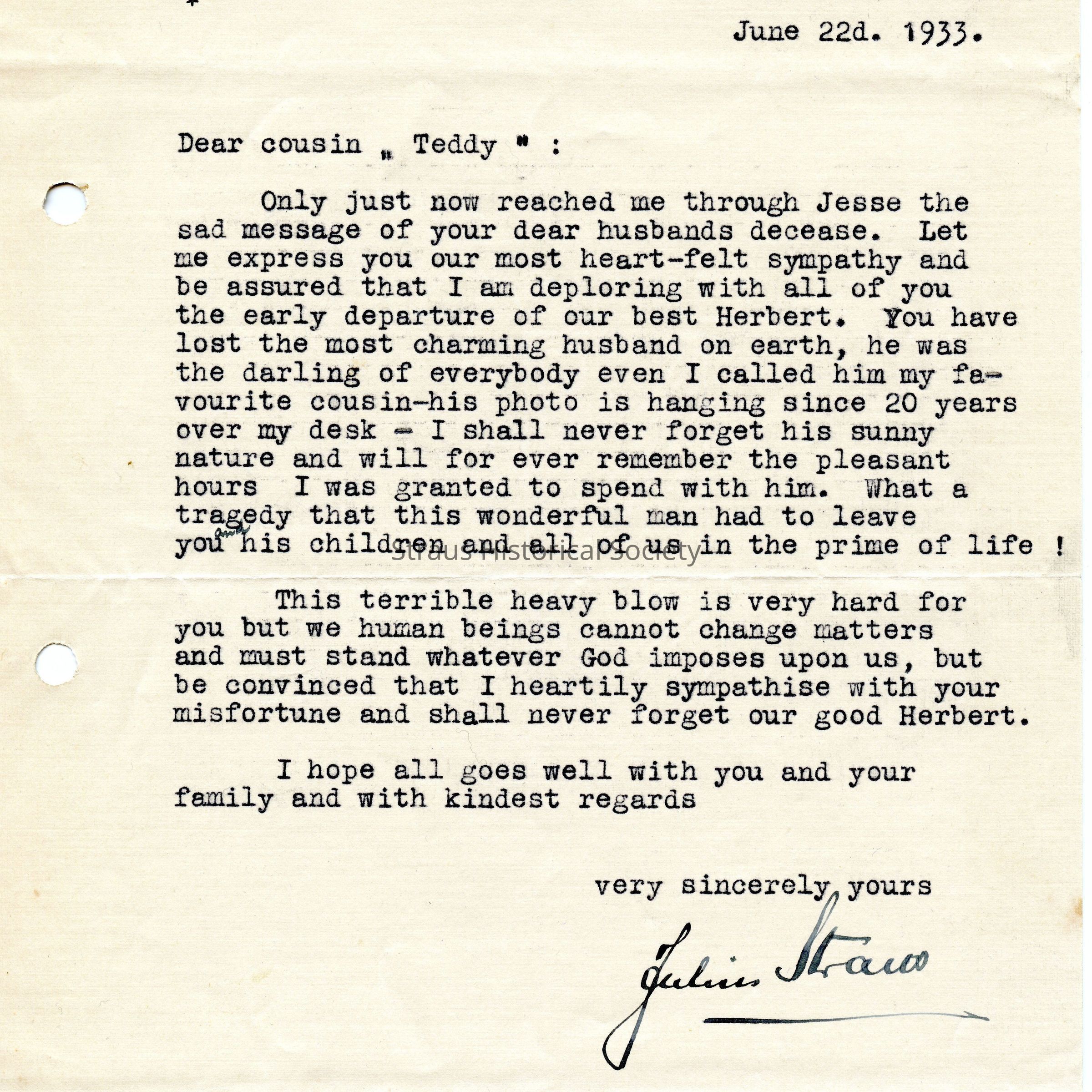 Letter of sympathy on Herbert's death. Herbert was the son of Isidor Straus.