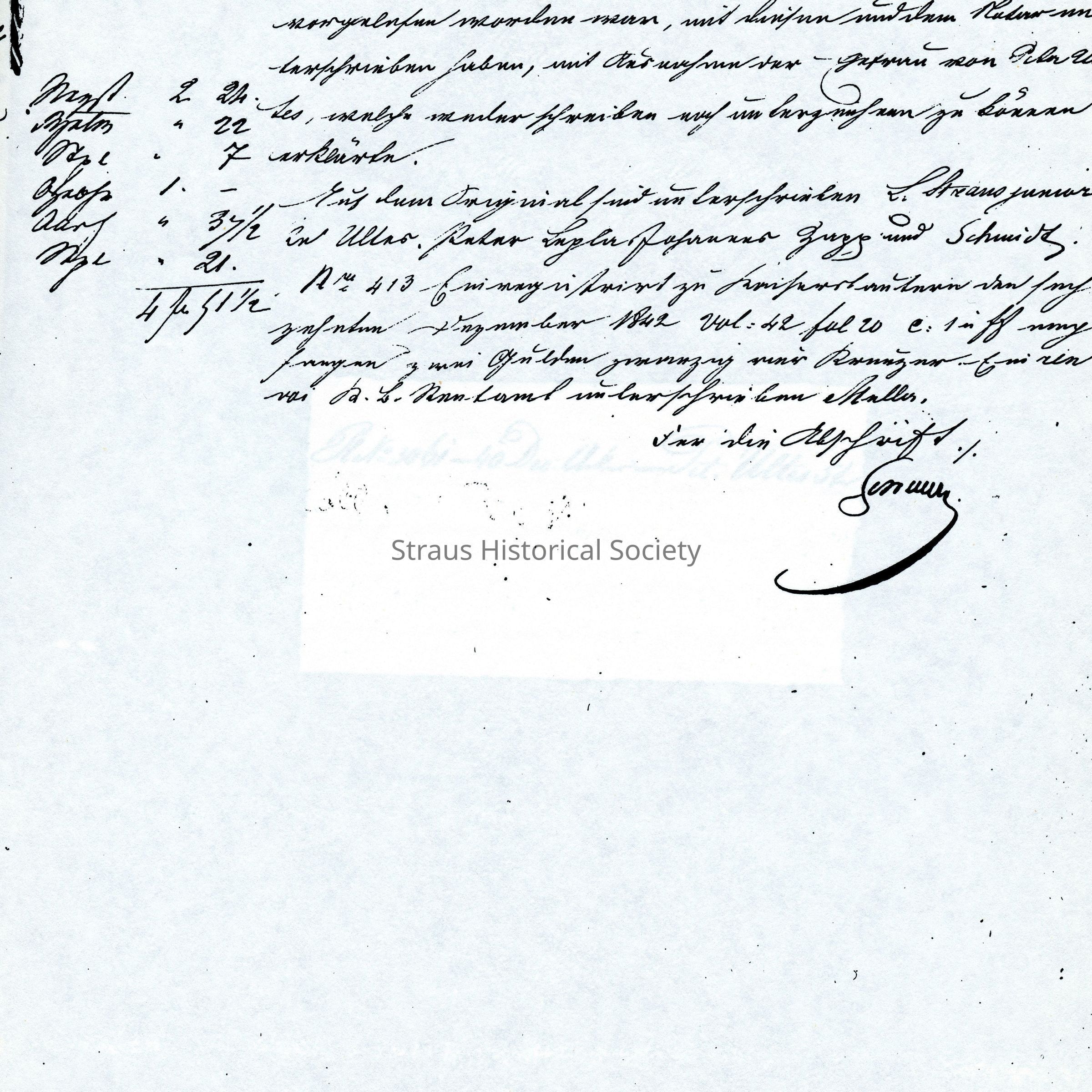 Business Paper: Vor Friedrich Ludwig Schmidt, mentions L. Straus junior No. 511. 5 December (?) 1842. In Old German. Not translated. Four handwritten pages.