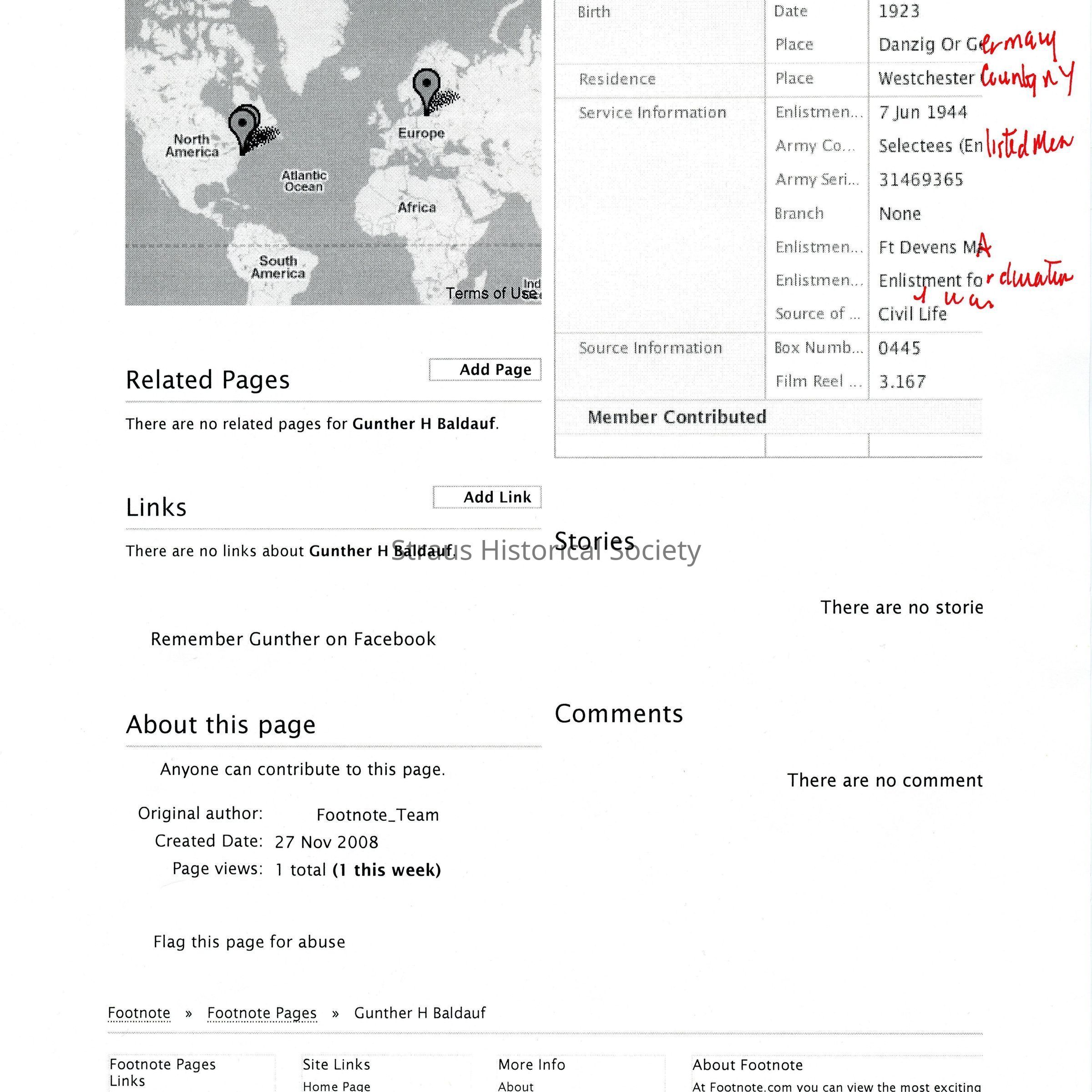 Gunther Herman Baldauf is the son of Grete Baldauf and the grandson of Herman Straus. The information provided is his date and place of birth, his residence and service information. Picture of Map shows where he lived in Europe and America.