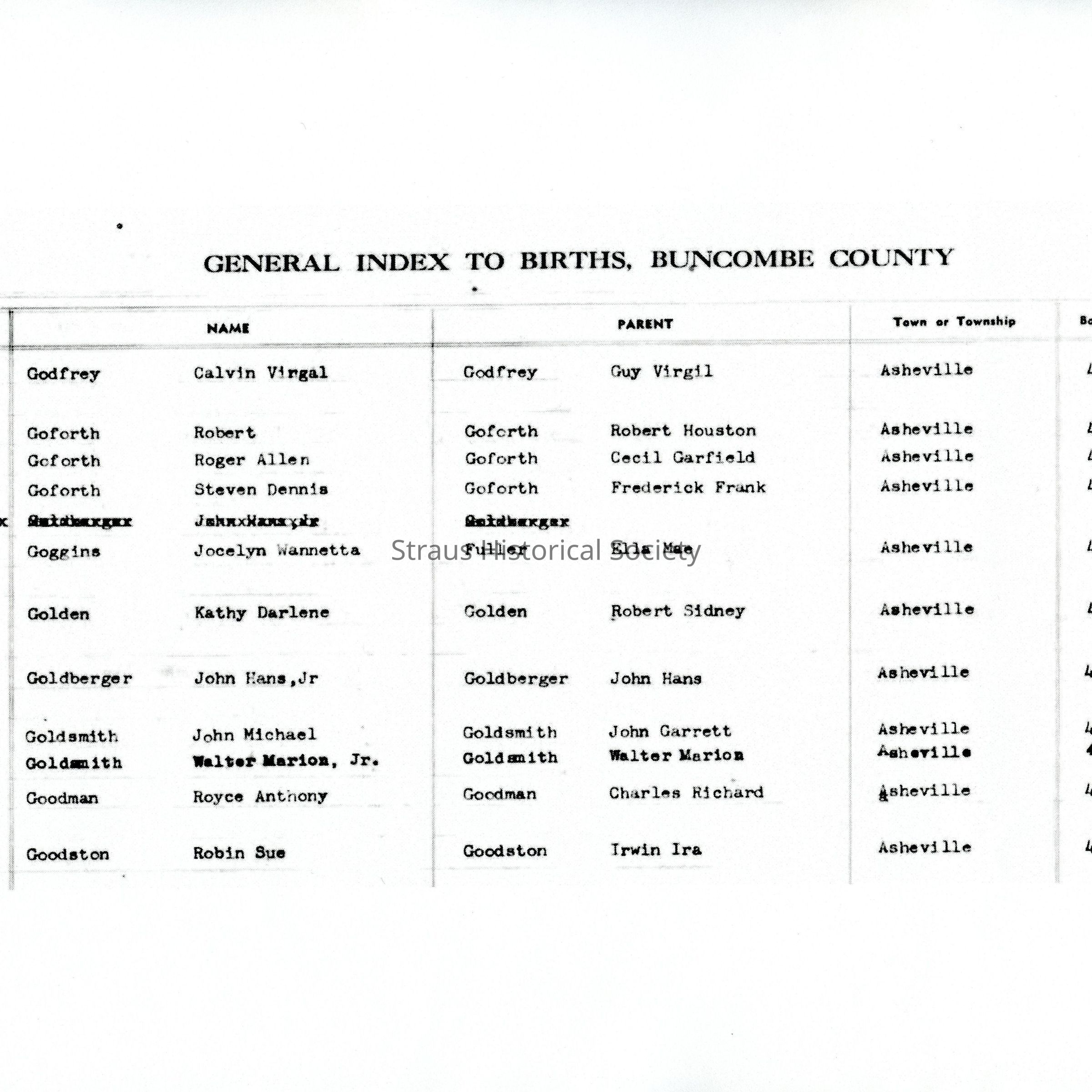 Birth Index: John Hans Goldberger, Jr. Born in Asheville, NC, 28 Aril 1954. Book 43, Page867.