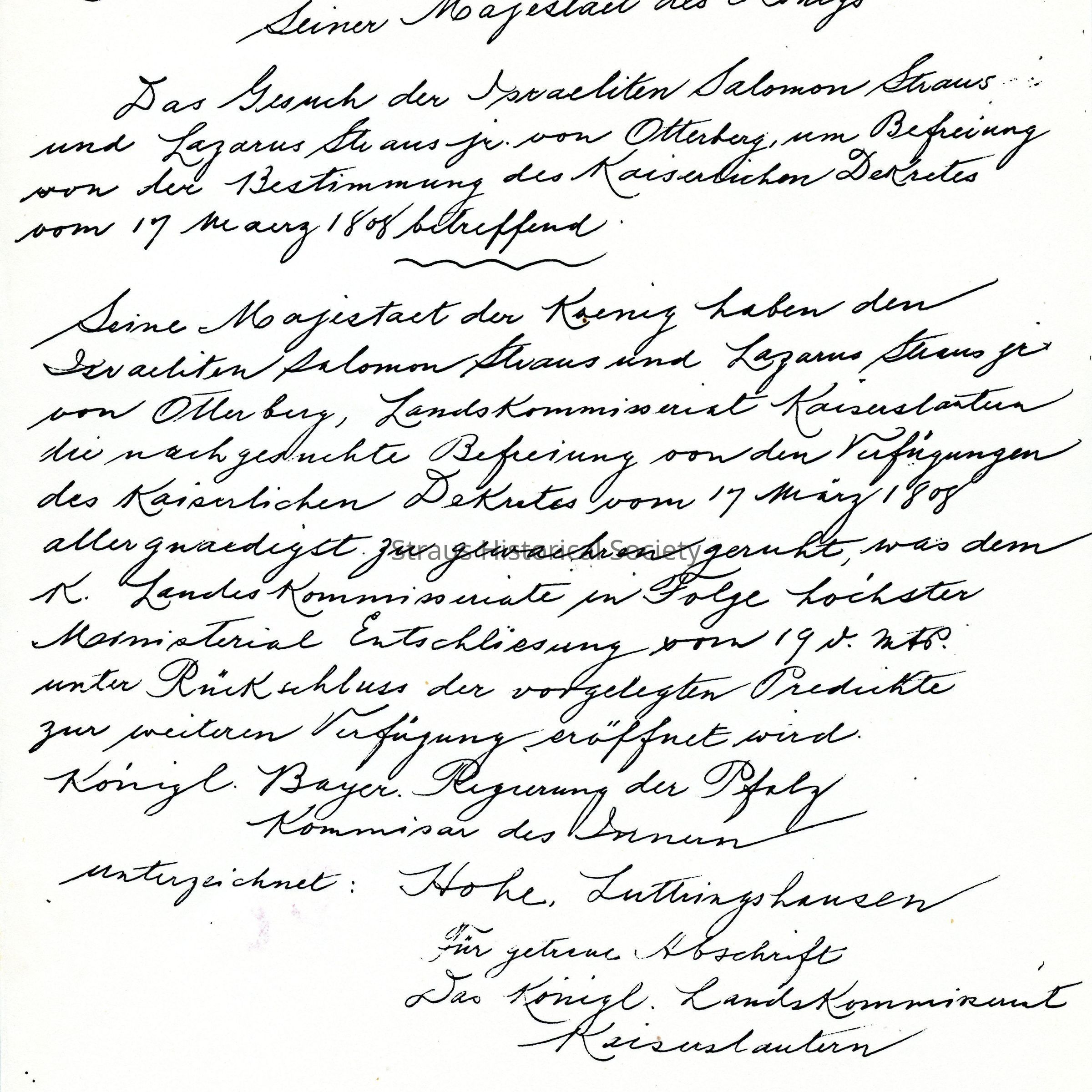 Business Paper: Im Namen Seiner Majestaet des Koenigs Das Gesuch der Israeliten Salomon Straus und Lazarus Straus jr. von Otterberg... (Application of Israelites Salomon Straus and Lazarus Straus junior of Otterberg) No. 469. 26 June 1850. In Old German. Not translated. One handwritten page.