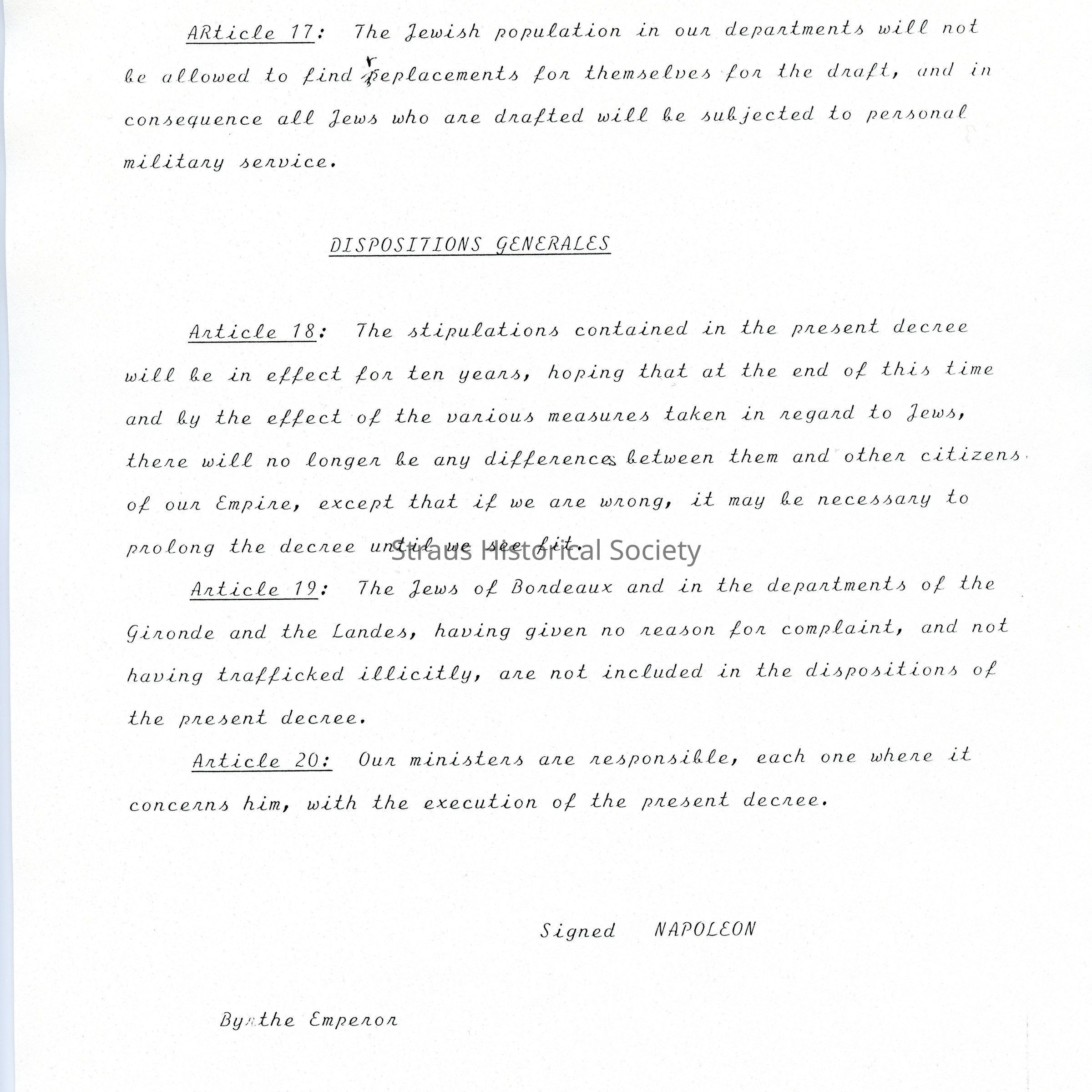 English translation of the declaration by Napoleon, regulating the Jews. French version is previous entry.