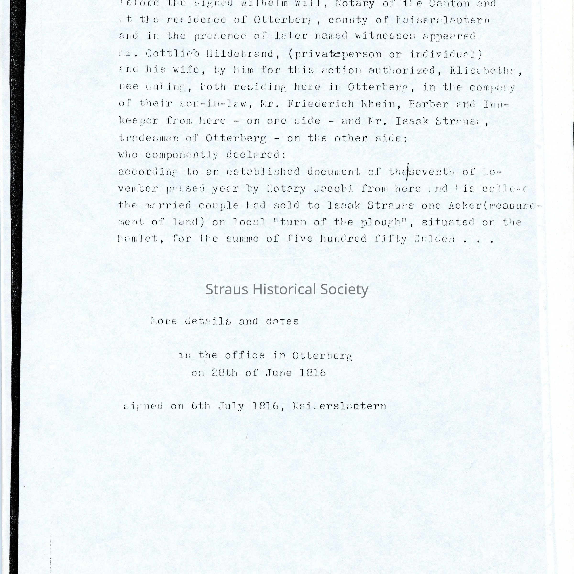 Business Paper: Sold to Isaak Strauss one "acker" of land for the sum of five hundred fifty Gulden. 28 June 1816. In Old German.Entry/Object ID